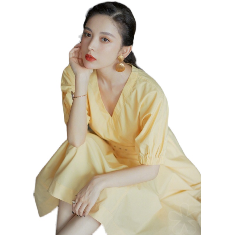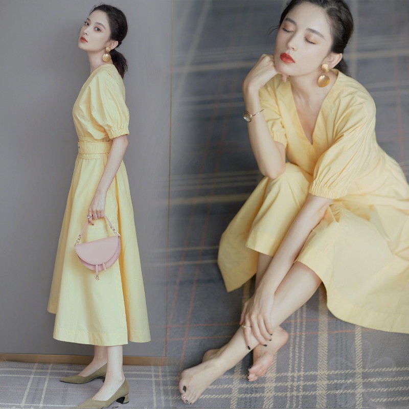 Celebrity Liu Yifei Guli Nazha same summer slim mid-length retro puff sleeve yellow short-sleeved dress