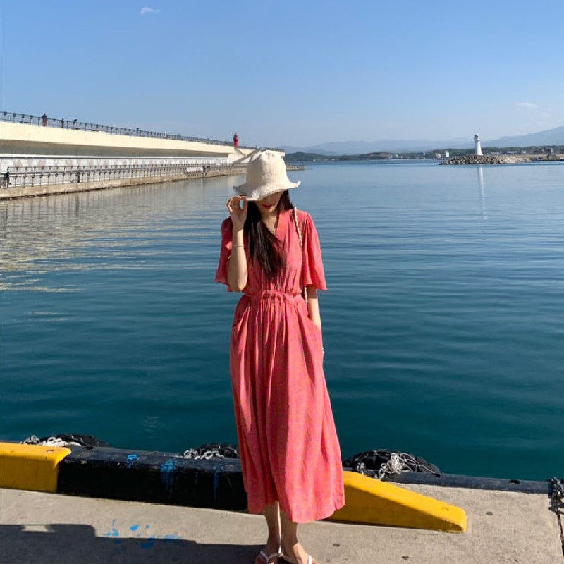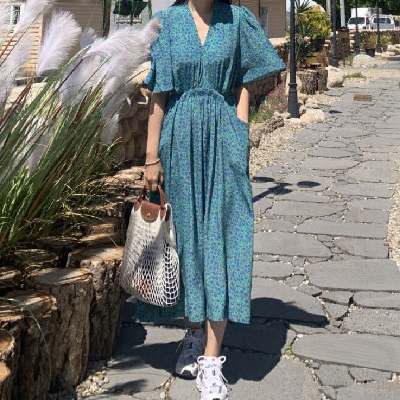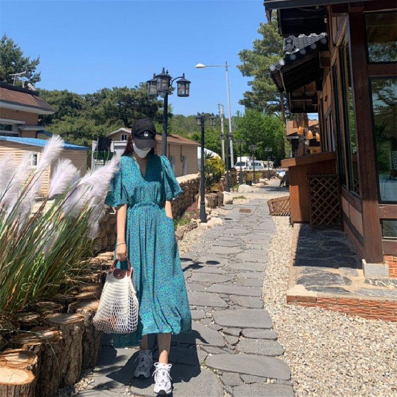 Blogger's 2022 summer new Korean French vintage tea break floral dress temperament V-neck chiffon long skirt