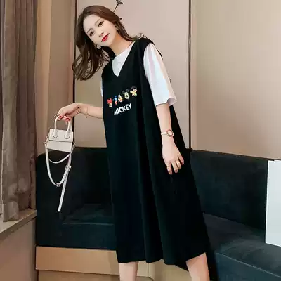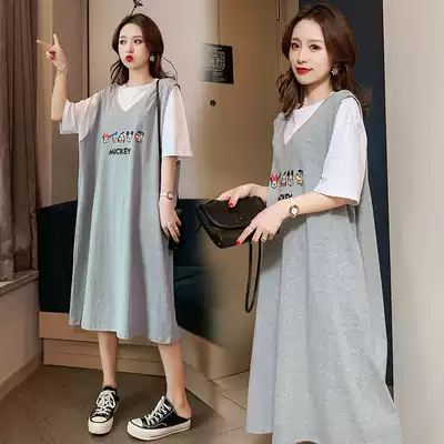 Japanese pregnant women summer dress dress suit fake two cotton short sleeve shirt loose slim big size pregnant woman skirt
