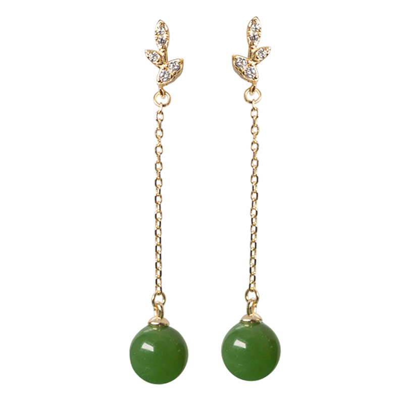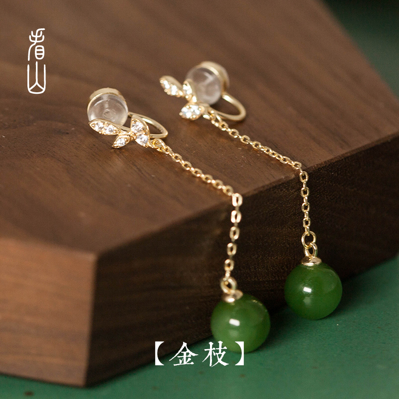 Look at the mountain) golden branches) and Tian jasper stone long ear clip line ornament without ear piercing female silver Yang green jade earring earring pendant