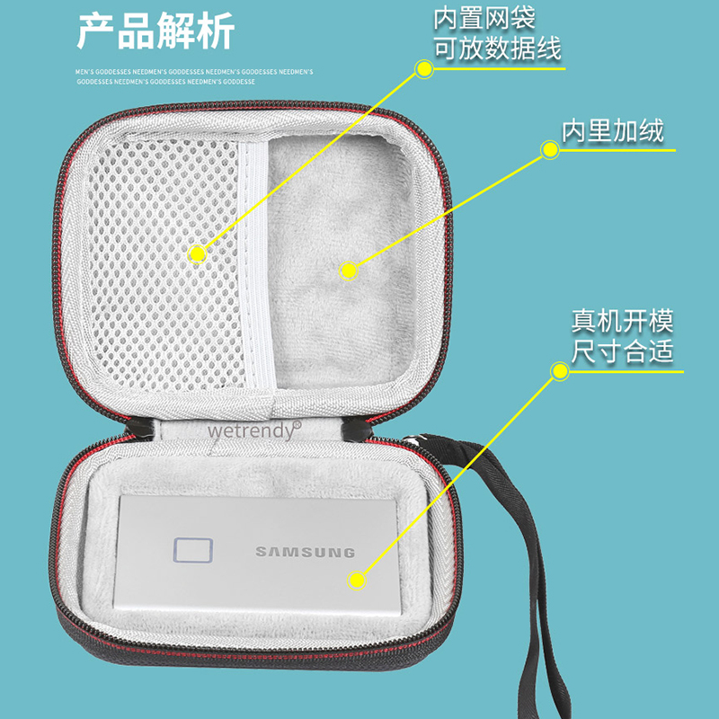Black storage bag (for T7), black silicone sleeve (for T7), white silicone sleeve (for T7), red silicone sleeve (for T7), blue silicone sleeve (for T7), black storage bag (for double sinks)