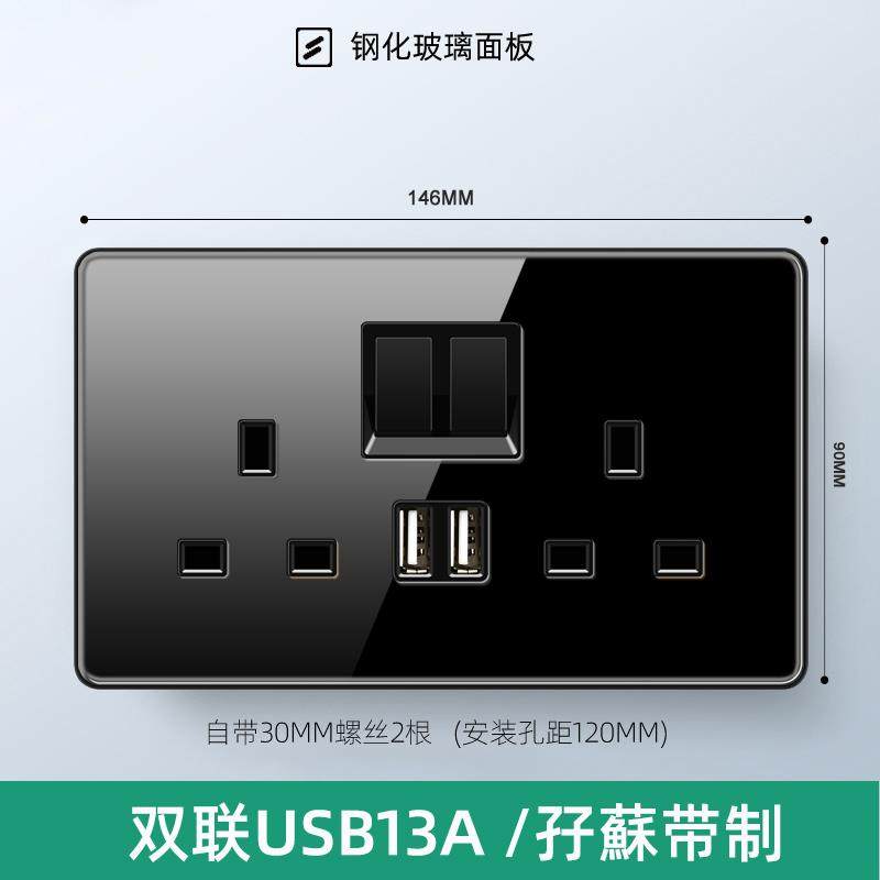 86 Concealed Hong Kong Version Home Lighting 13A Socket with USB British Switch Panel Black Tempered Glass