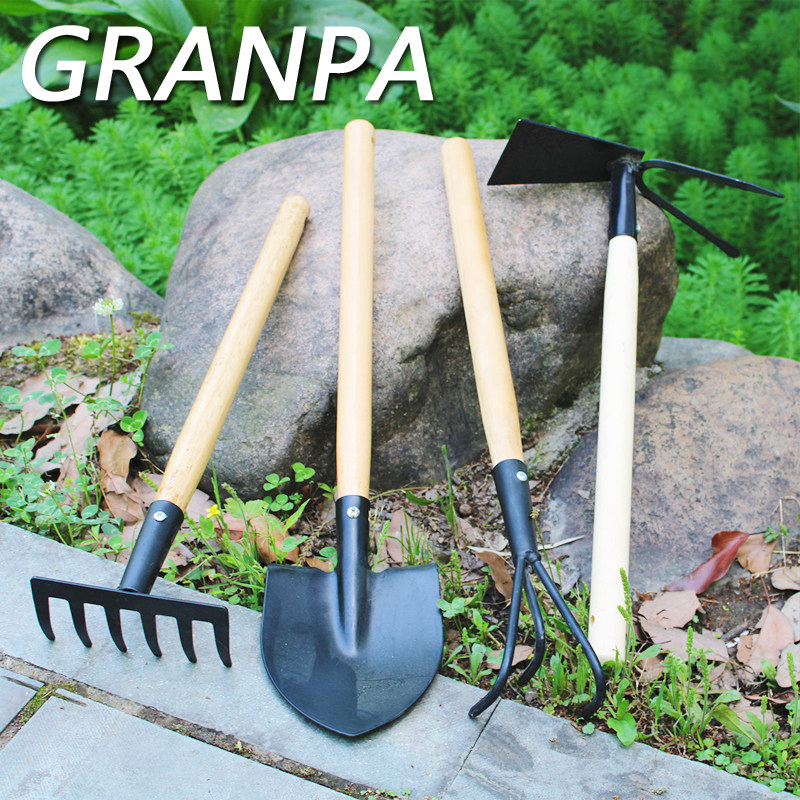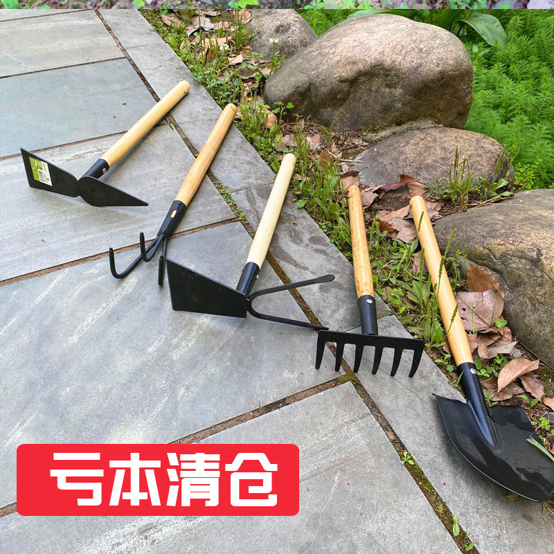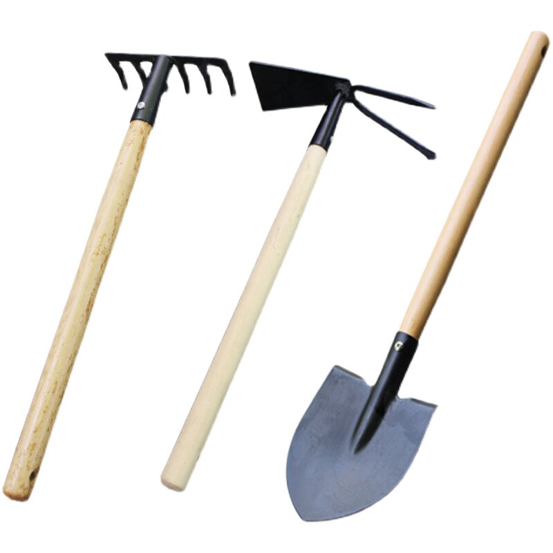 Black shovel with long wooden handle, black shovel with long wooden handle, black five-tooth rake, long wooden handle, black three-claw long wooden handle, black pointed hoe, long wooden handle, black fork and hoe, long wooden handle