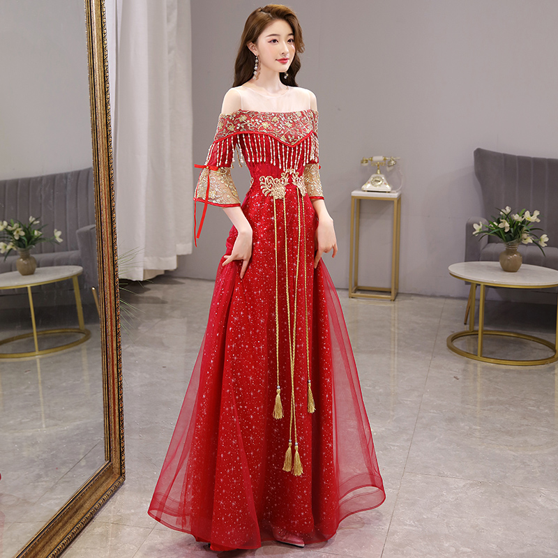 Red Late dress 2022 Bride wedding New Summer French Princess Long dress Banquet engagement normally available to wear