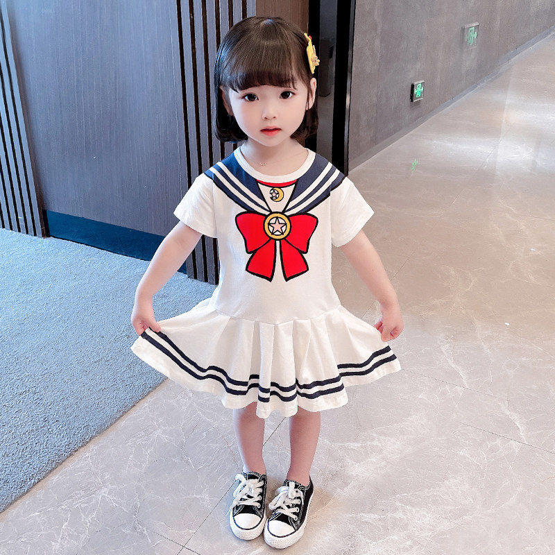 Girls Navy Neck Dress Sailor Moon Children's Skirt Summer College Style Cotton Baby A-Line Skirt Fried