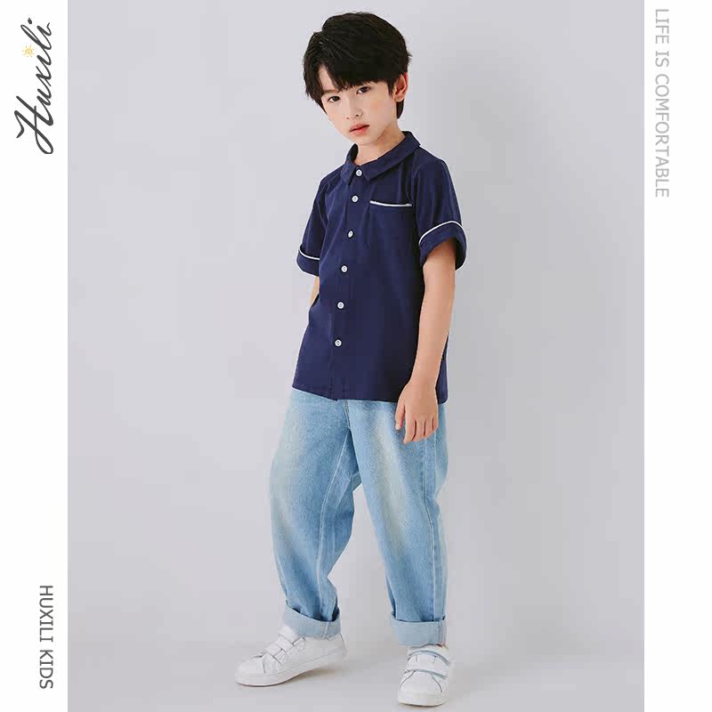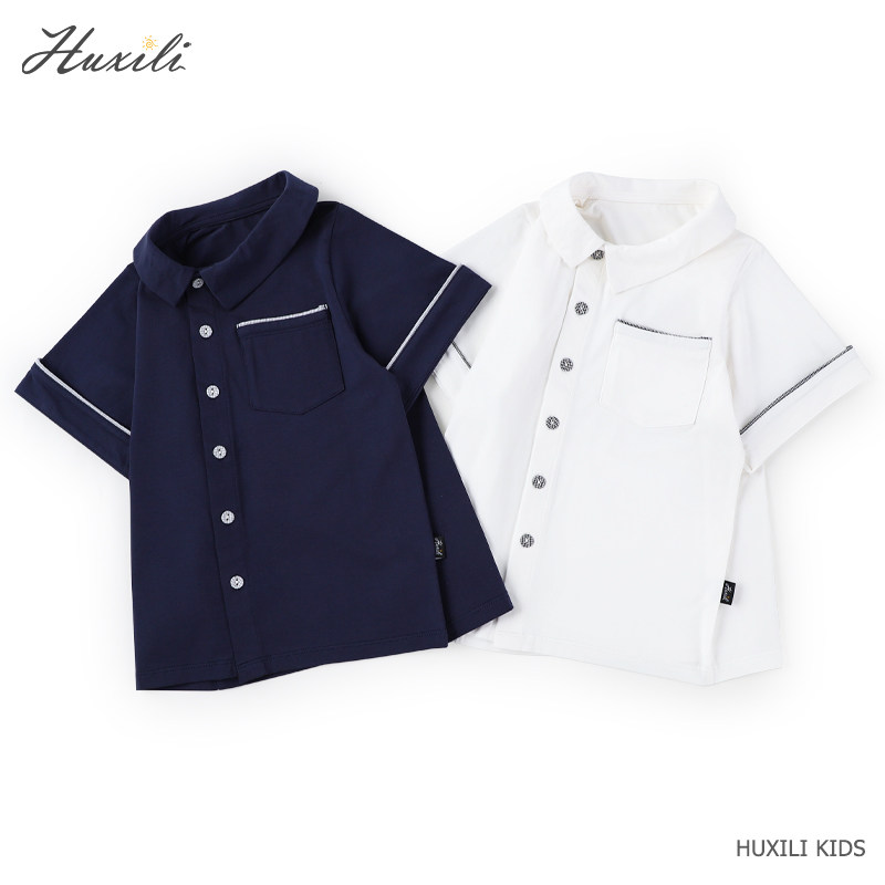 Huxili 2021 summer children's clothing boys' shirts short-sleeved all-match literary small fresh Western style lapel contrast color top