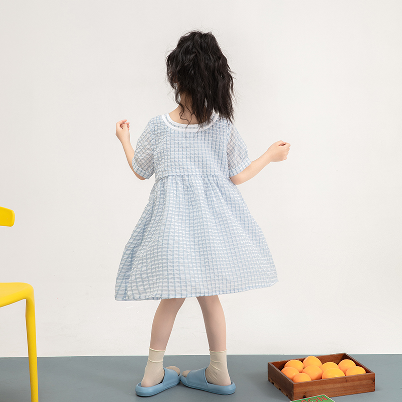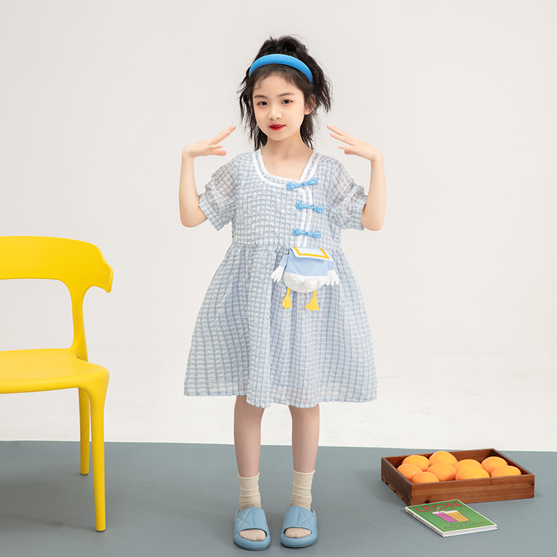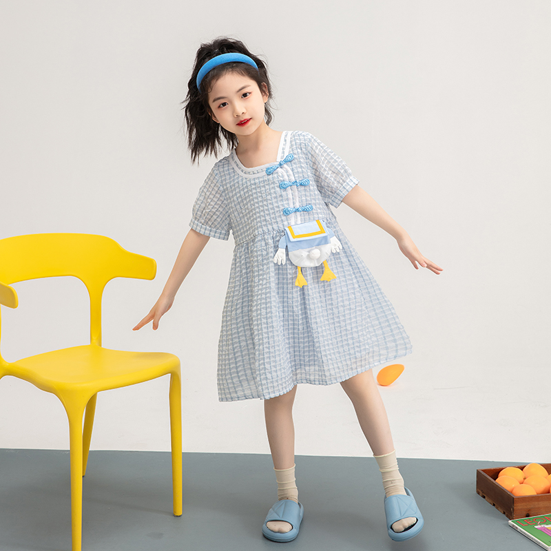 Parent-child outfit mother-daughter cartoon girl dress 2021 summer new Foreign style bubble sleeve girl plaid skirt children