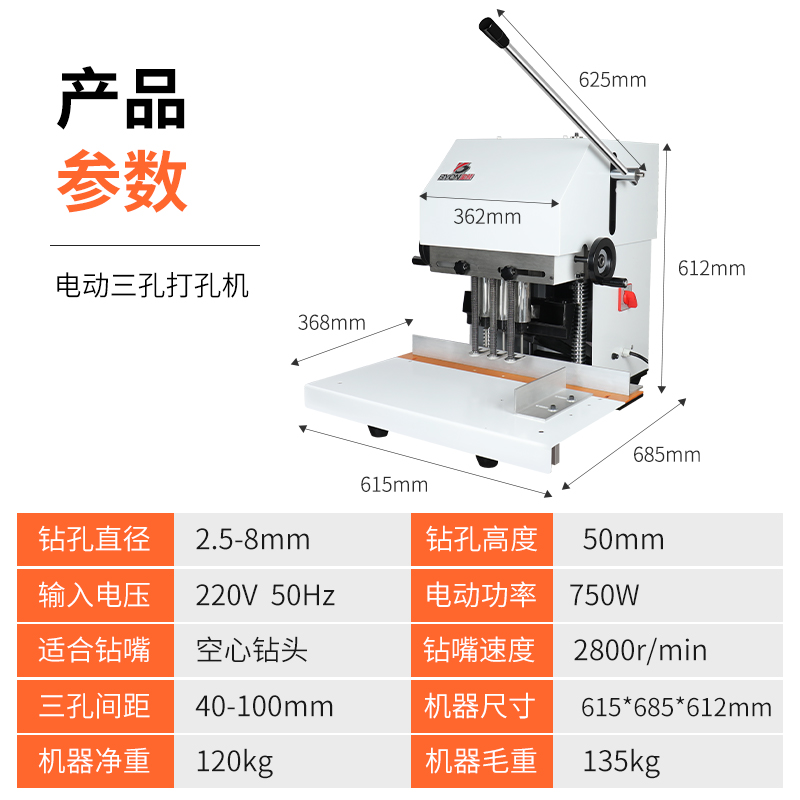 Bao pre-three-head punching machine electric tag paper notebook loose-leaf three-hole punching binding machine office voucher file automatic drilling machine spacing adjustable paper bag punching machine pure copper motor