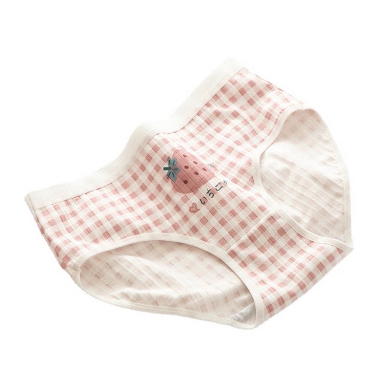 Plaid strawberry breathable cotton cute sweet girl Japanese briefs bag hip pure cotton crotch mid-waist underwear female student