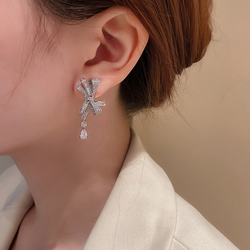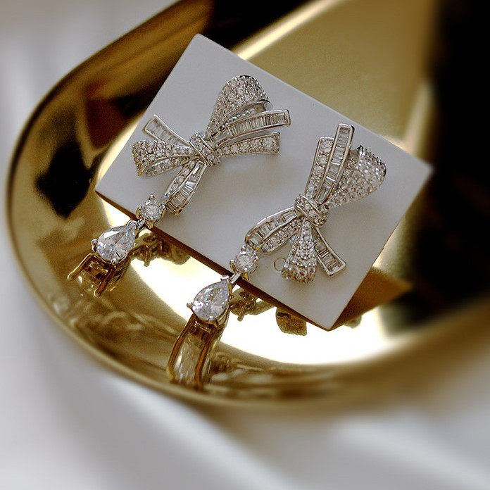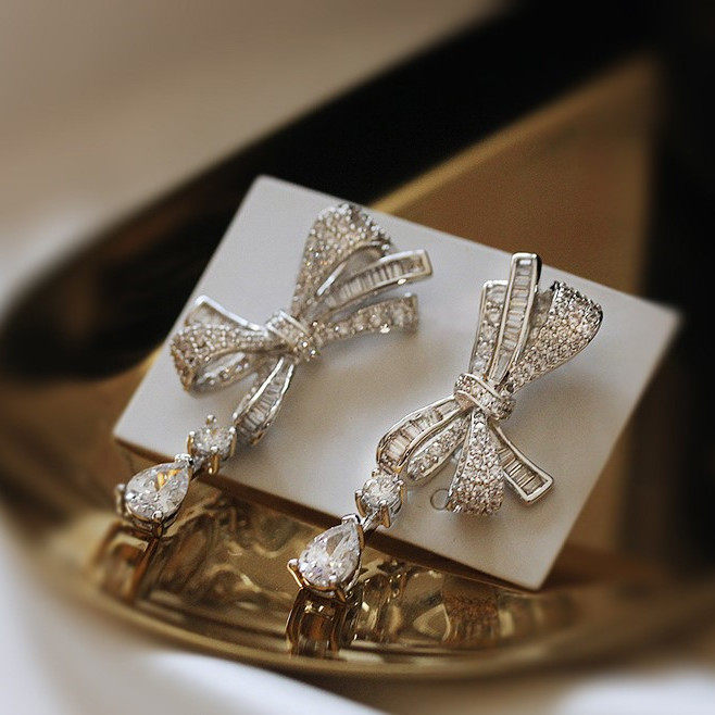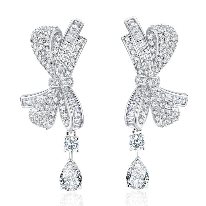 Sterling silver platinum plated bow drop ear studs Pure platinum bow drop drop stud