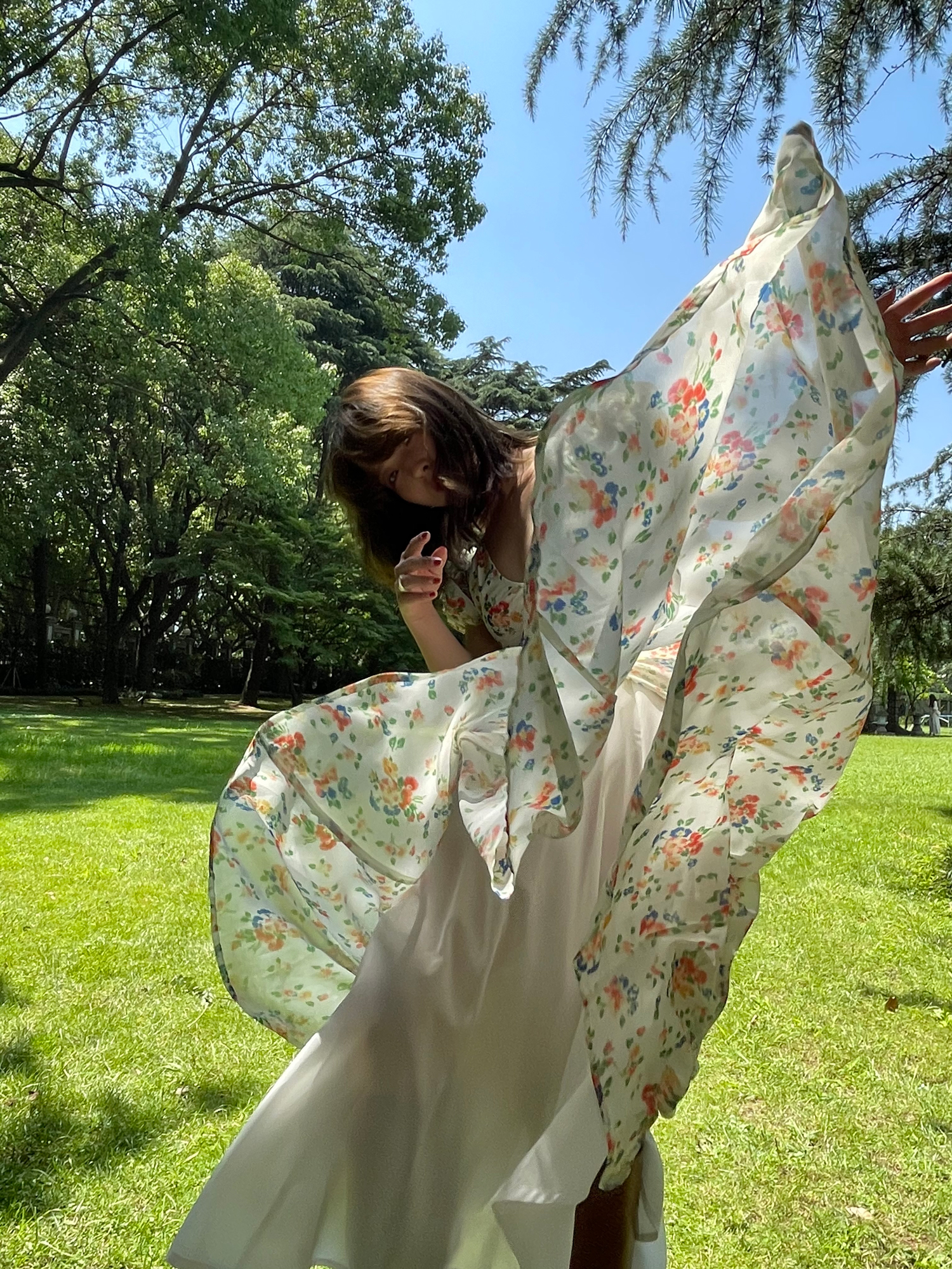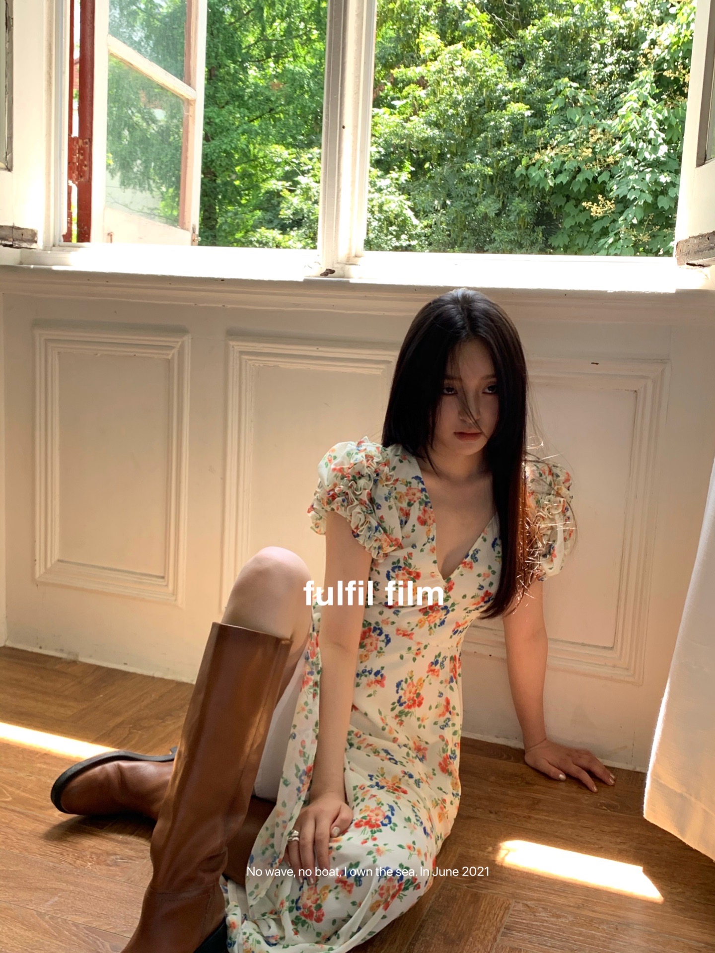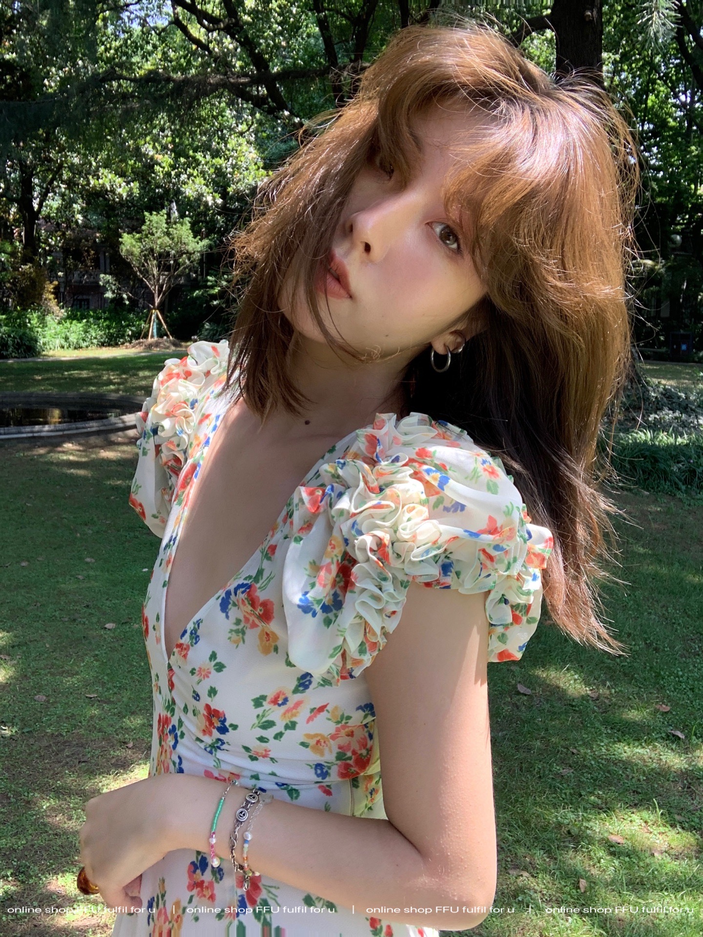 FFU French floral dress women's new summer V-neck heavy industry niche mid-length sexy long skirt QZ