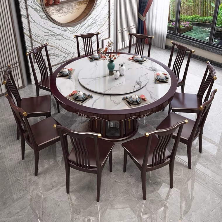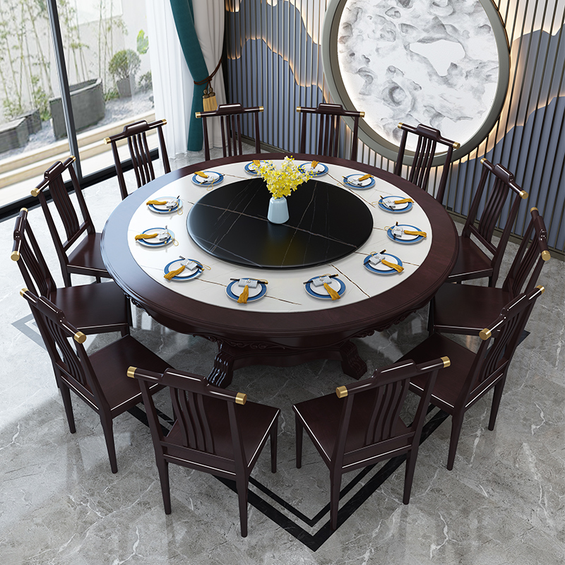 New Chinese style solid wood rock board dining table and chair combination modern minimalist hotel large round table 2 meters with turntable 12 people dining table