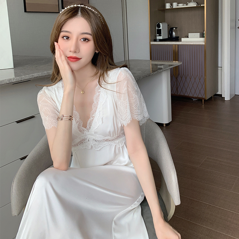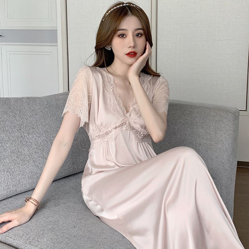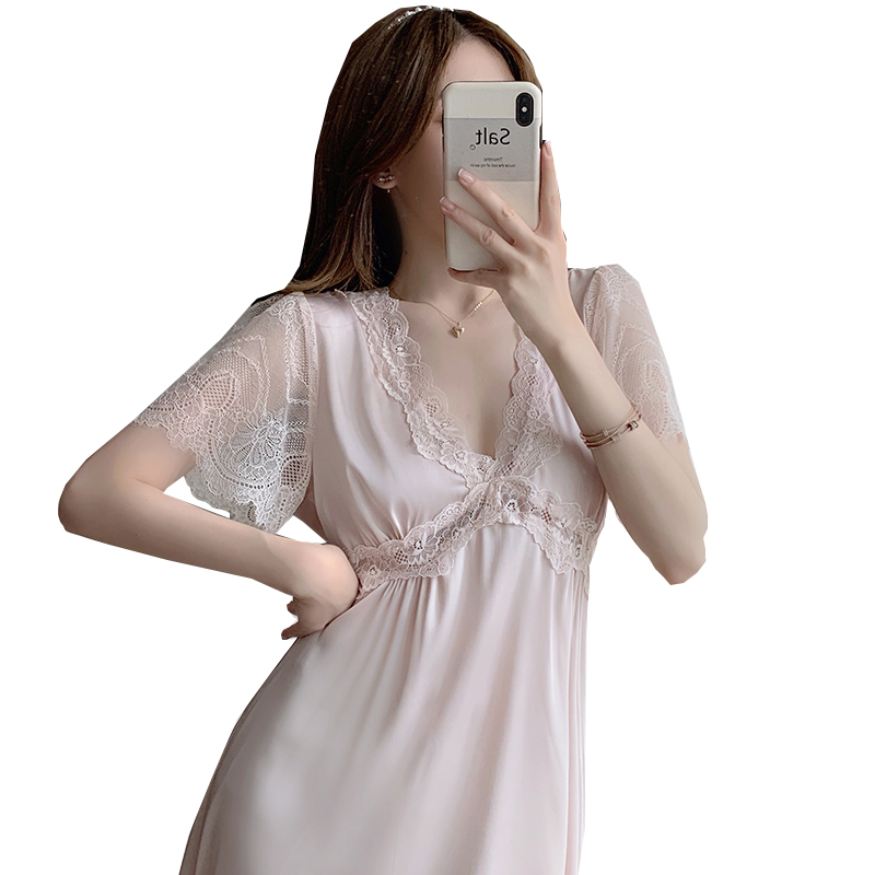 French Sexy Lace Sleeping Sleeping Female Summer Ice Wire Short-sleeved Sleeping Snapy Pink Luxury Courtyard Silk Home Clothes