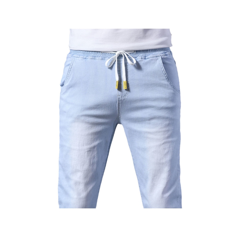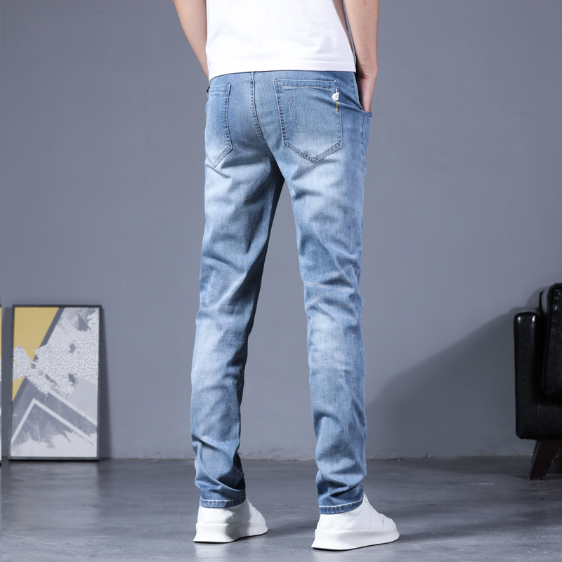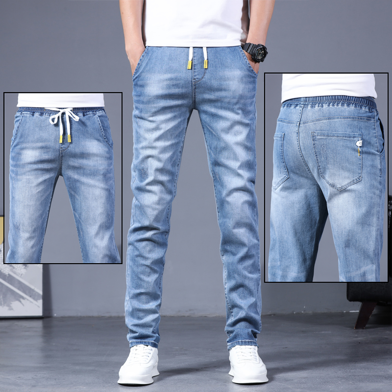Summer new jeans Men's flex waist Supper body small feet Straight cylinder pants Men's Korean version Trend casual long pants
