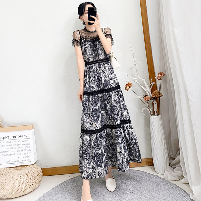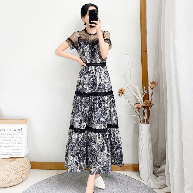 2022 new women's dress Summer French style retro lace splicing long version of women's cashew with slim temperament long dress