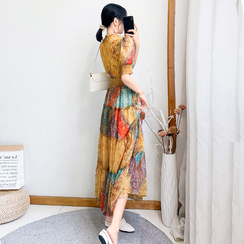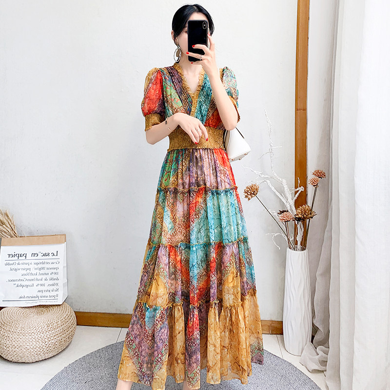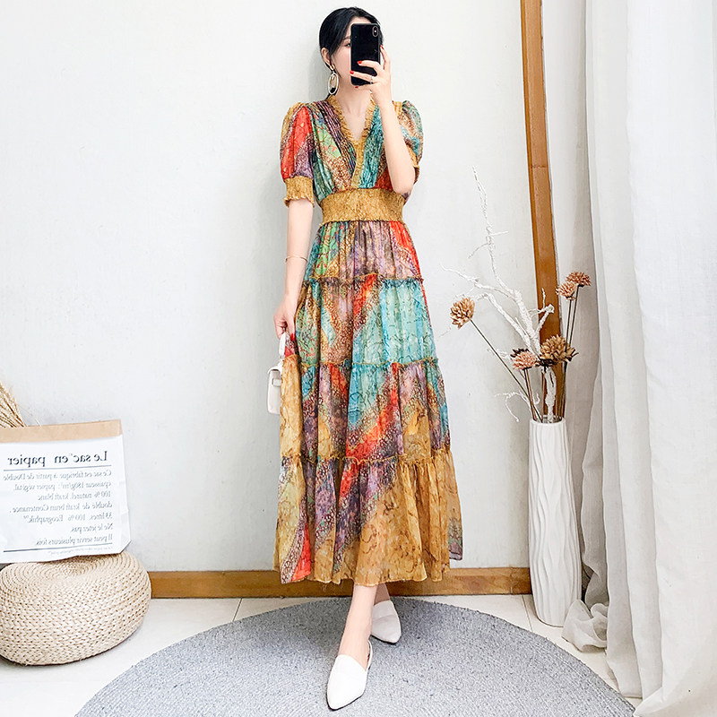 2022 new women's clothing Summer closets slim temperament over knee long version of women's snowspun beach printed long dress