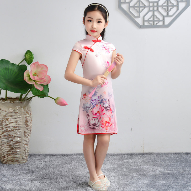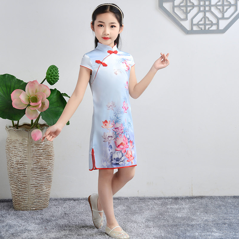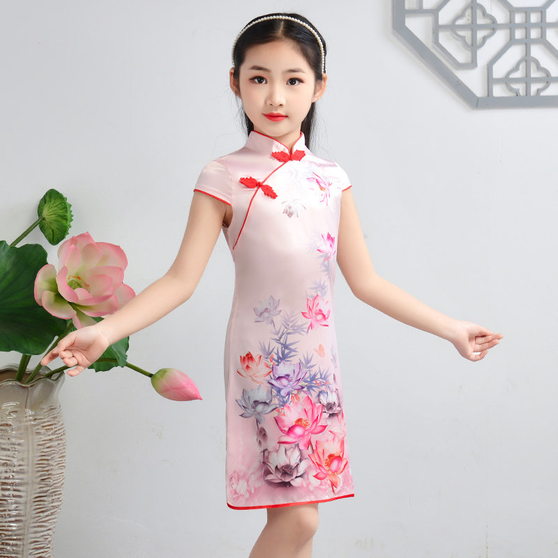 Girls Cheongsam Summer Chinese Style Little Girl Children 2021 New Western Style Silk Modified Dress Summer