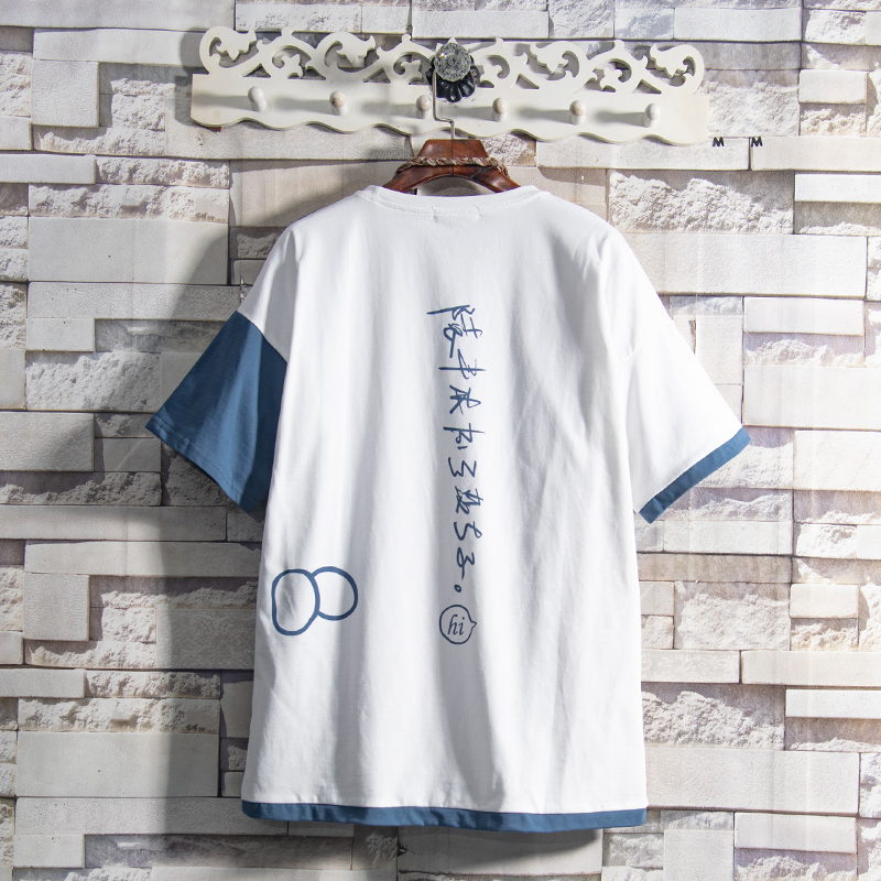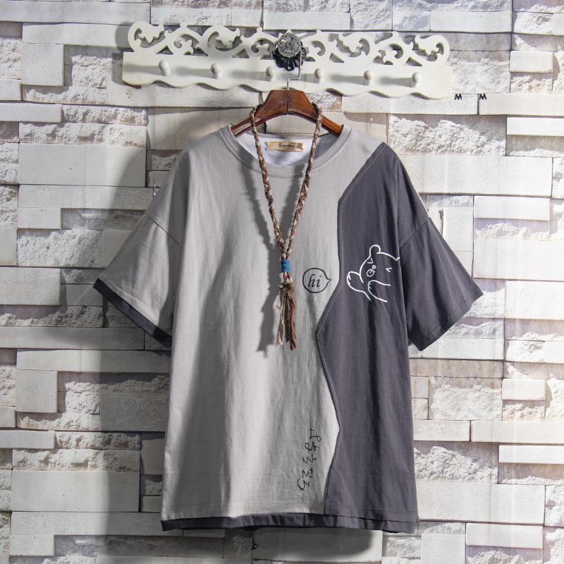 Flammable youth Japanese tide brand ins color-blocking youth short-sleeved t-shirt men's loose design round neck T-shirt clothes