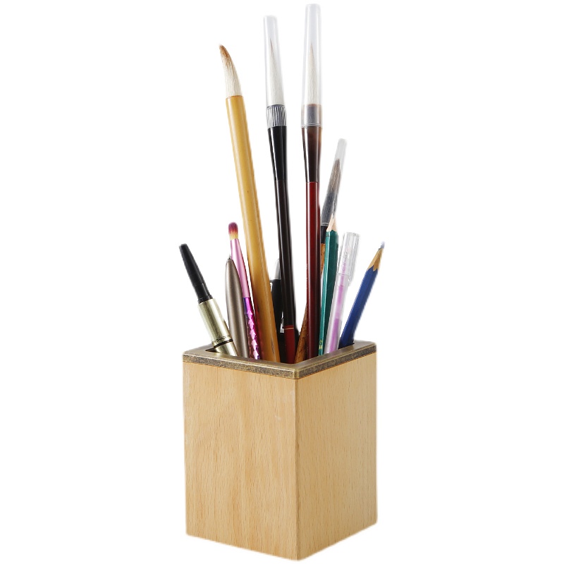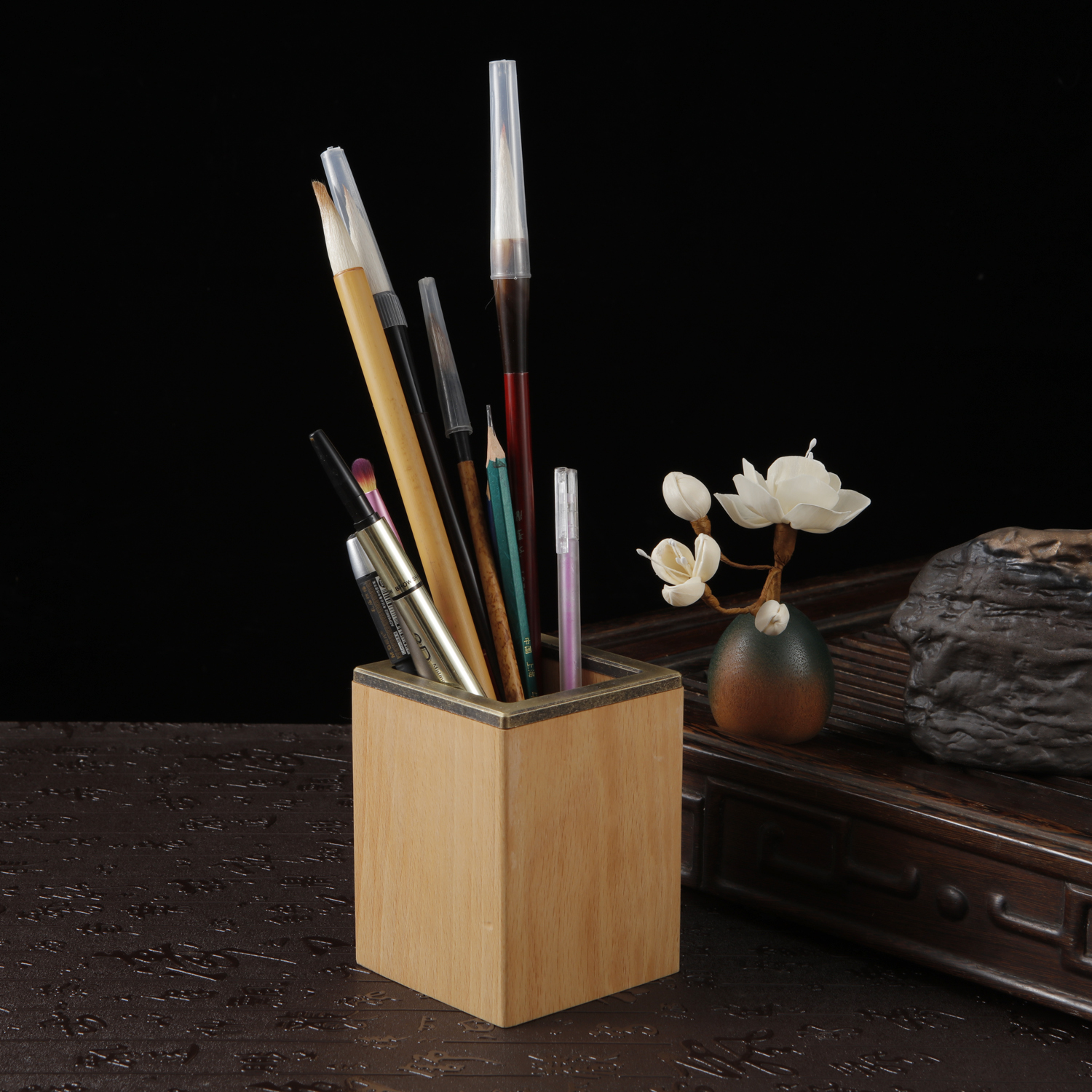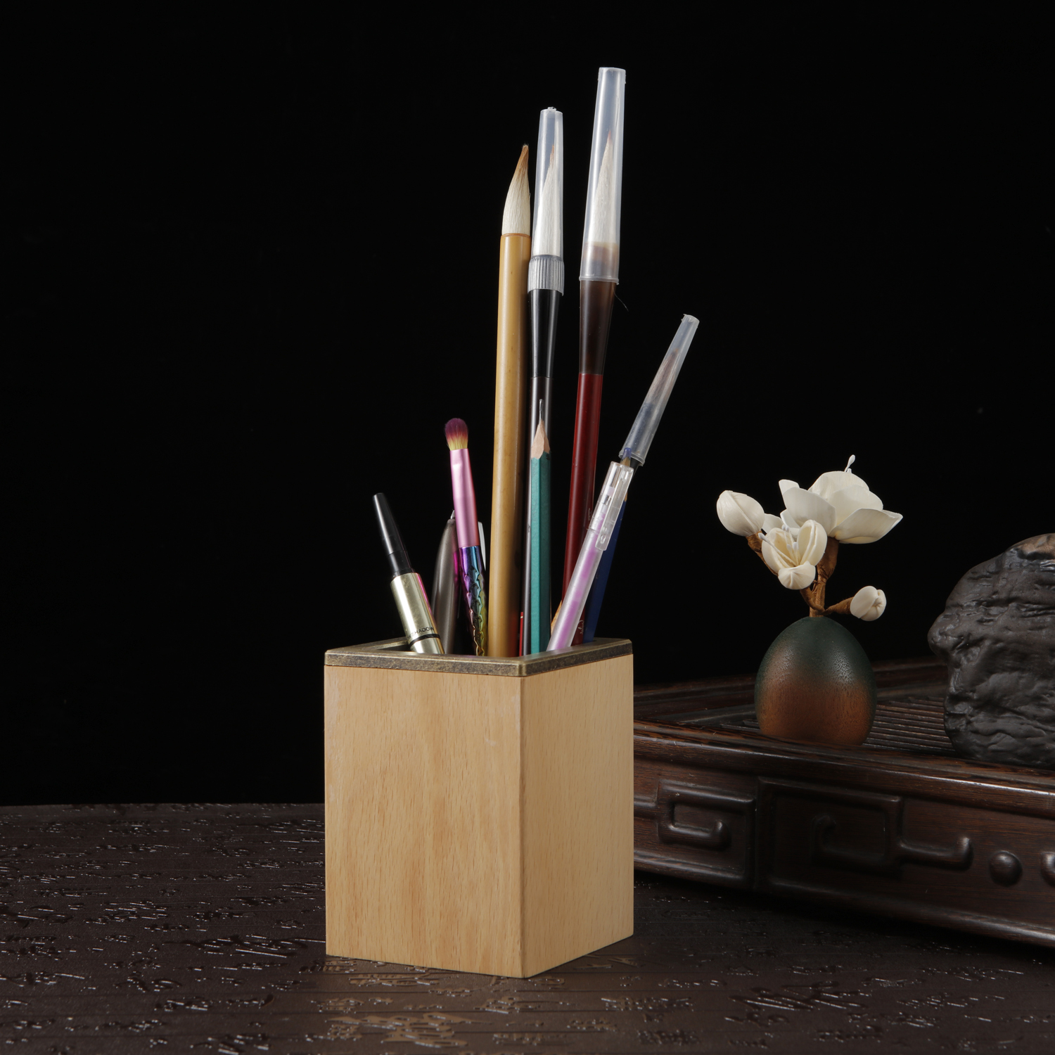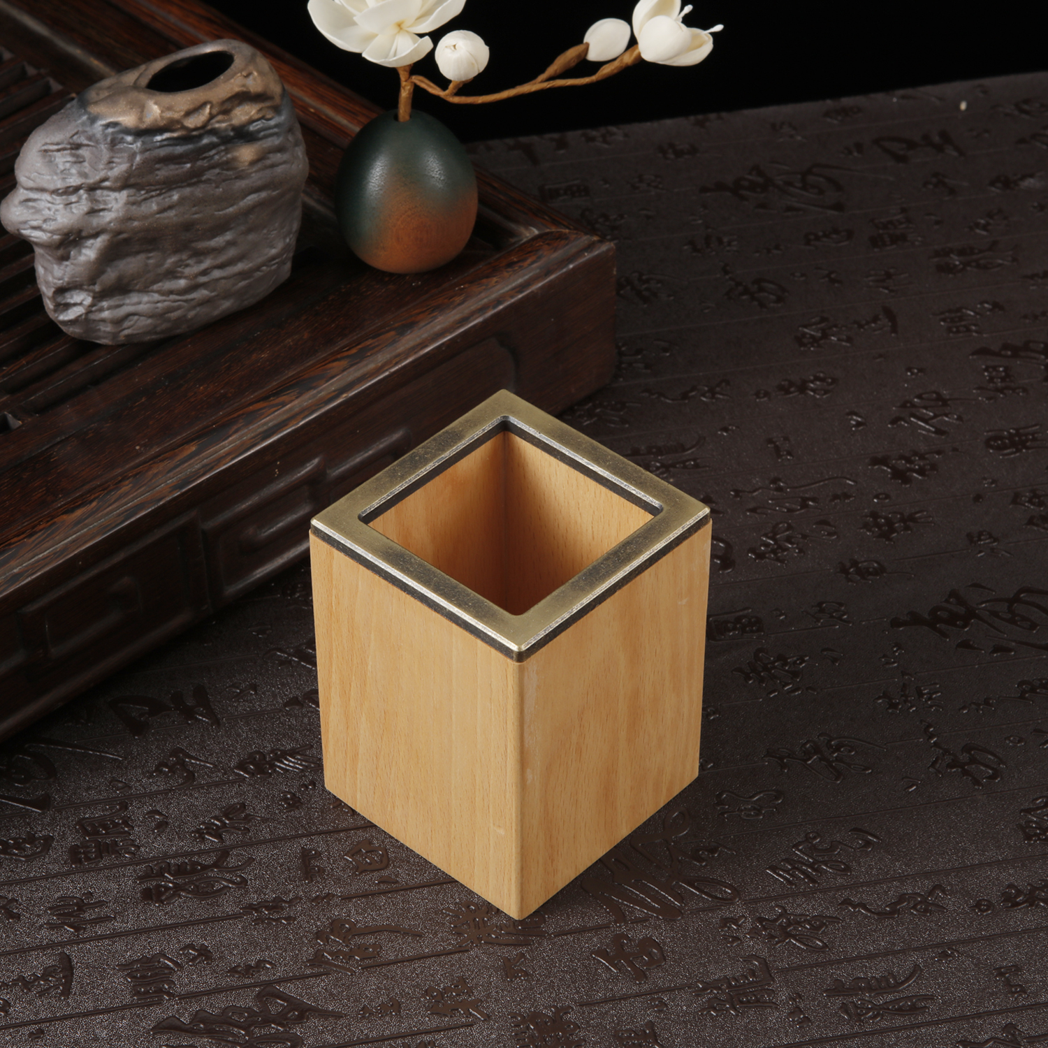 New Chinese retro solid wood metal inlaid square pen holder office stationery containing box gift pen barrel