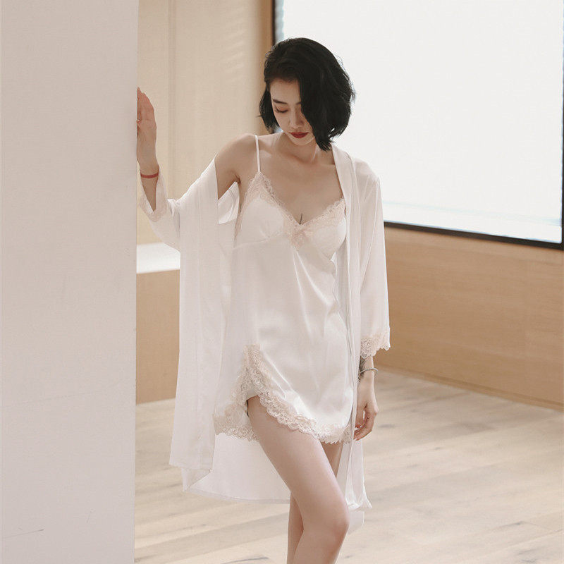 Sexy Sleepwear Women's Summer Real Silk Lace Lace Sleepsy Sleeping Dress With Chest Cushion Sleeping Robe Ice Silk Two Sets Comfort