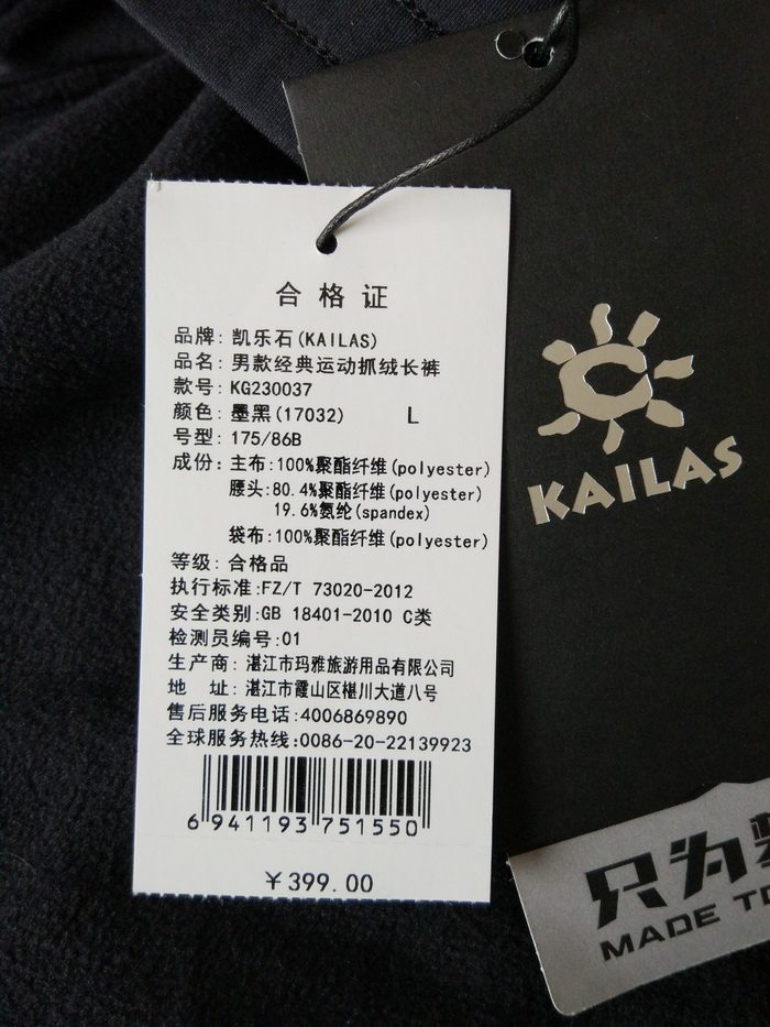 KAILAS outdoor sports men's autumn and winter hiking windproof breathable warm classic sports fleece trousers