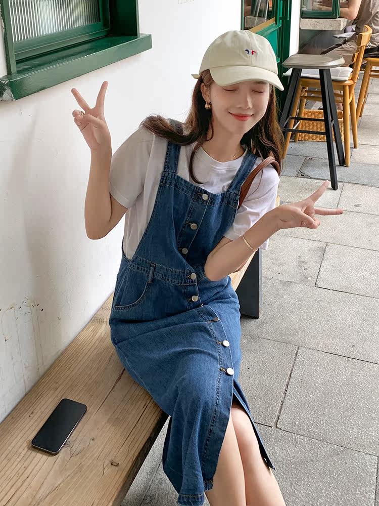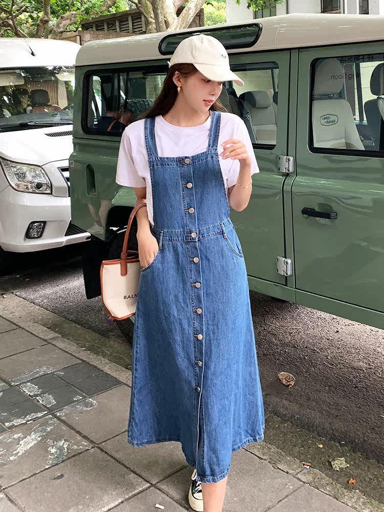 First love western style age reduction temperament denim strap dress women summer thin section long section slit thin 2022 new