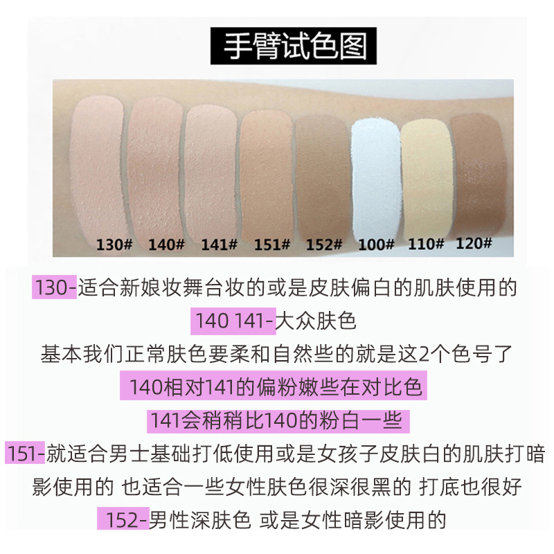 130 bright color Stage makeup Common color 140 Natural color 141 Light complexion 151 Deep complexion 152 Dark complexion 100#白色110#偏黄白色120#褐色象牙白散