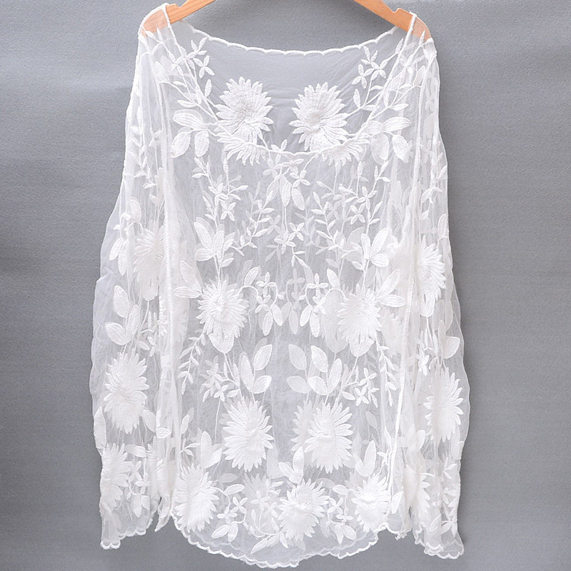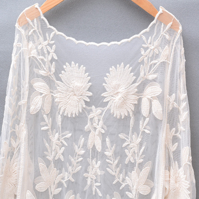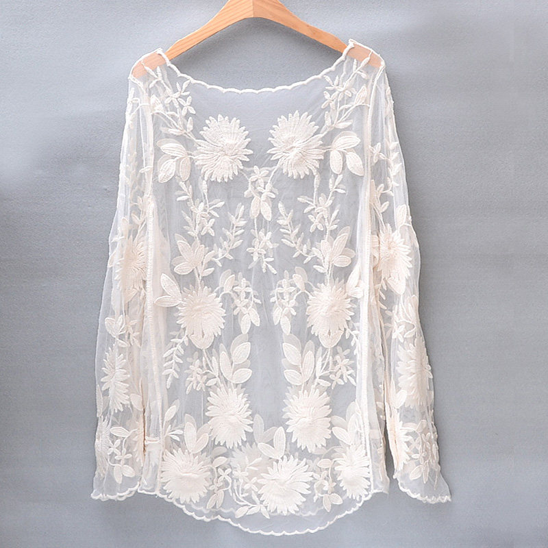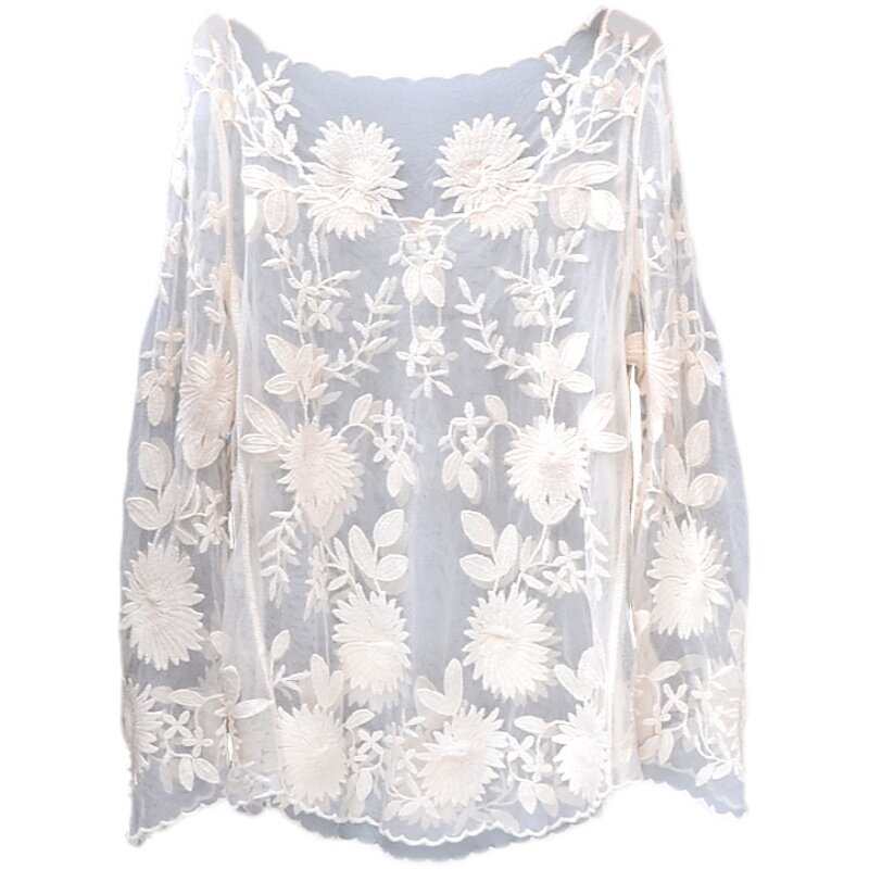 Lace bikini blouse mid-length version transparent sunscreen beach seaside long-sleeved shade round neck pullover female loose