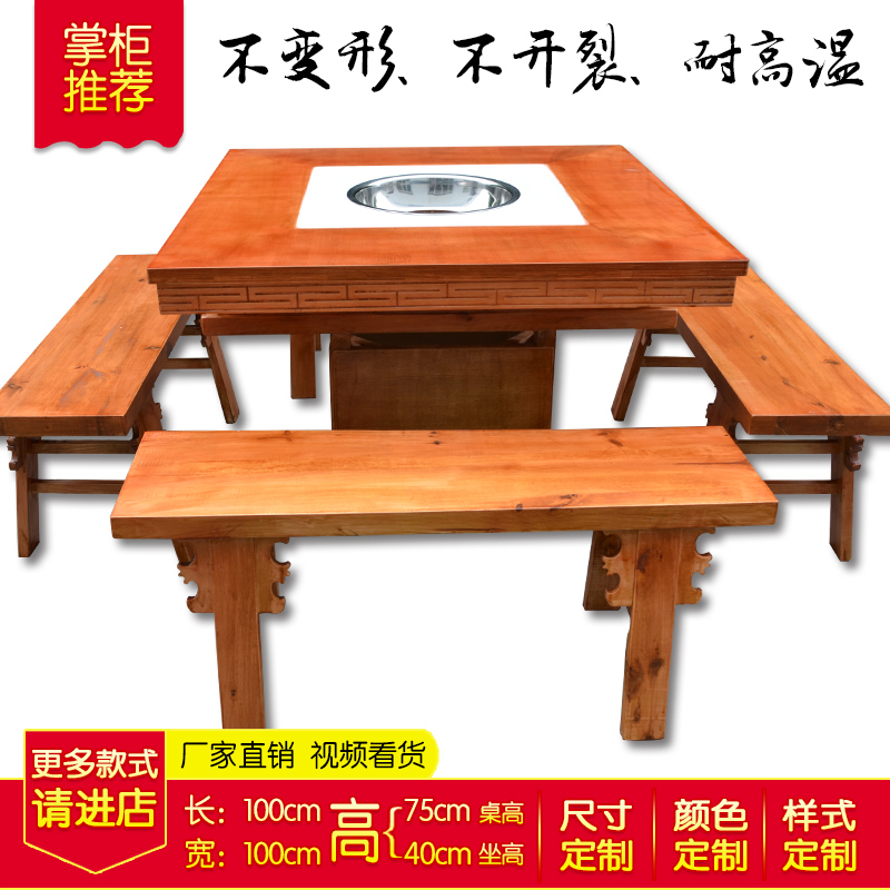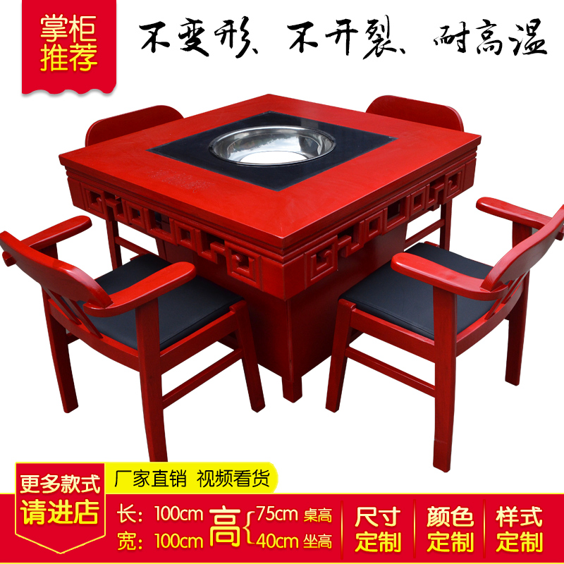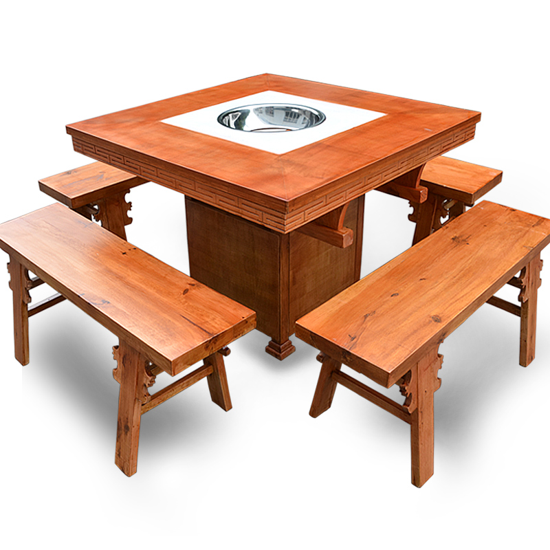 Chinese retro marble hot pot table and chair Solid wood carved hot pot string induction cooker one-piece restaurant table customization