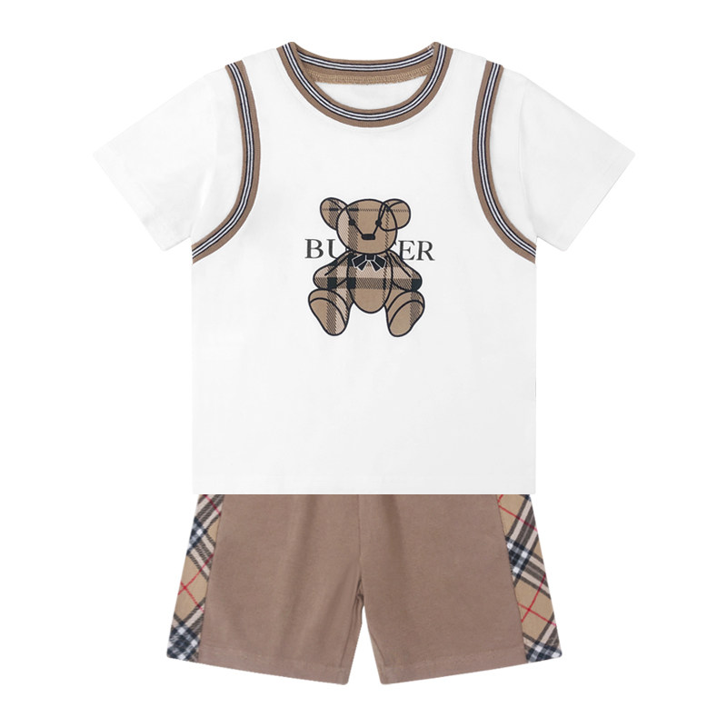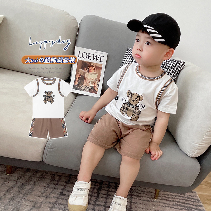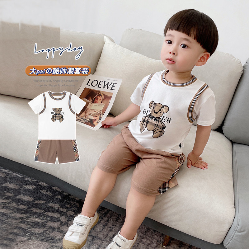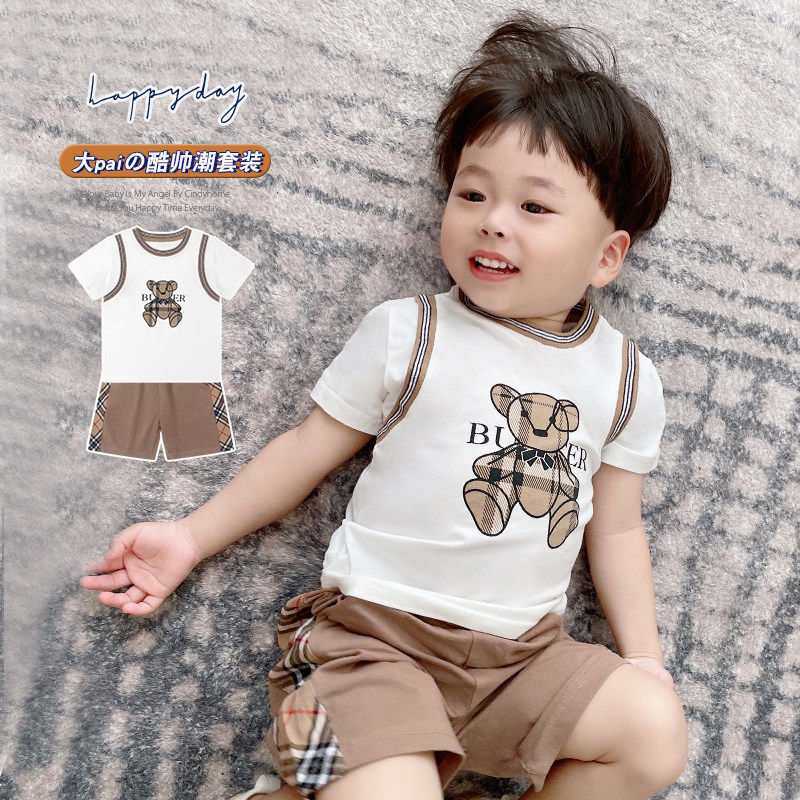Ingléin Wind Cartoon Little Bear Boy Suit Summer Thinness Pure Cotton Short Sleeve Child Tide Nets Red Baby Clothes