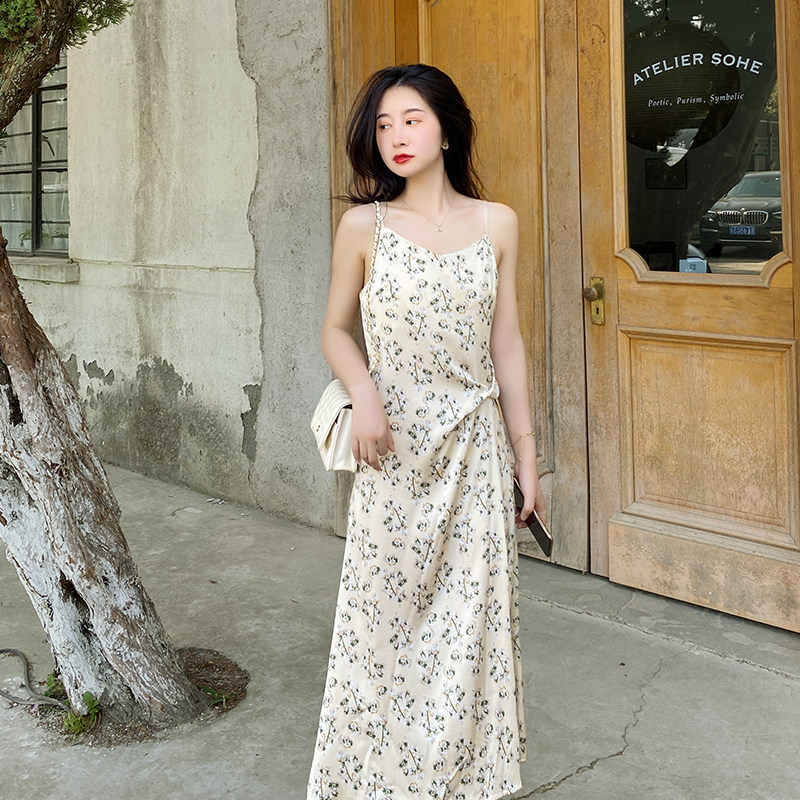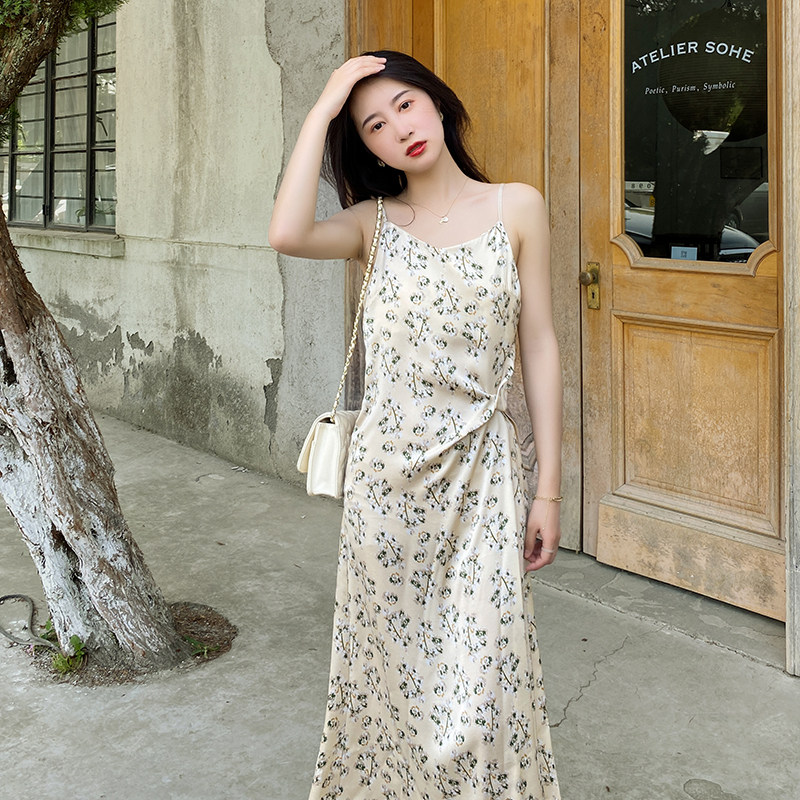 Concubine with blouse and suspenders dress women's spring and summer floral retro slim V-neck acetate satin dress