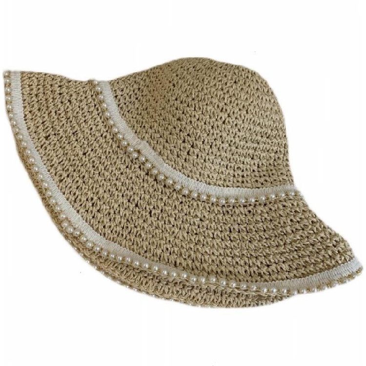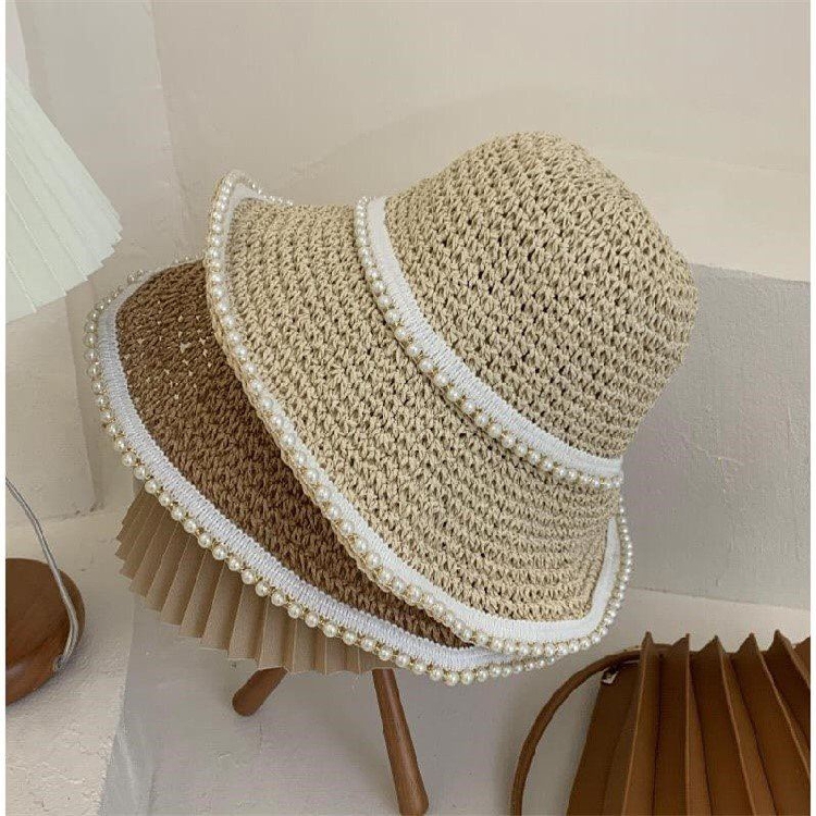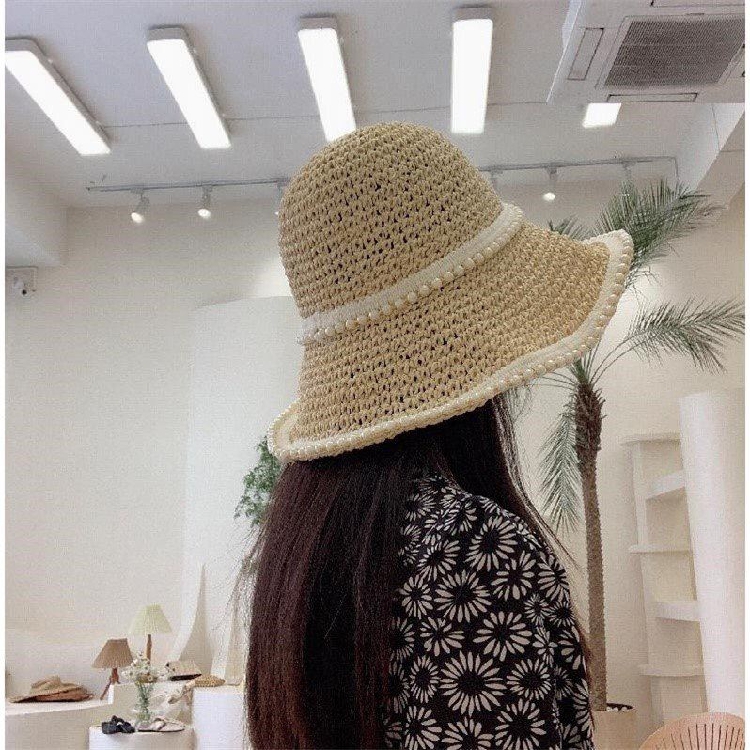 Small fresh hat women's woven pearl straw hat summer sunscreen sunshade sunscreen seaside beach fisherman hat sun hat