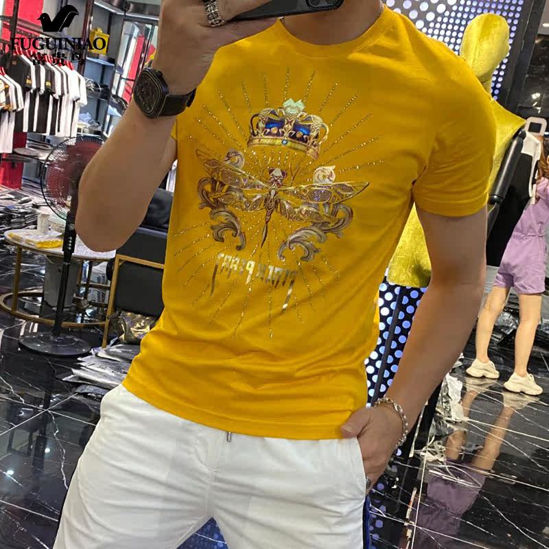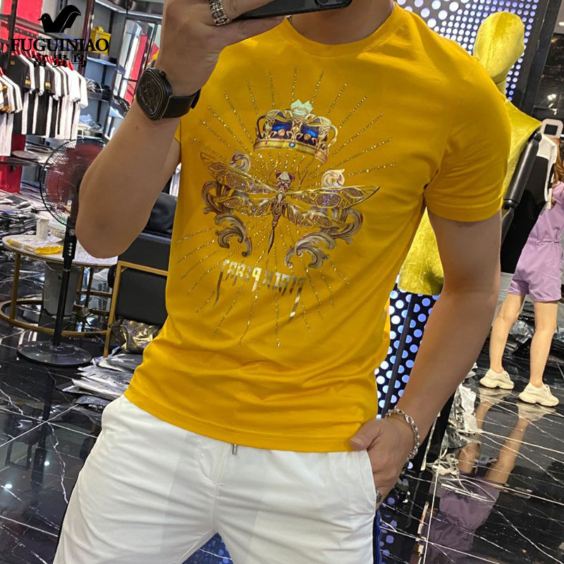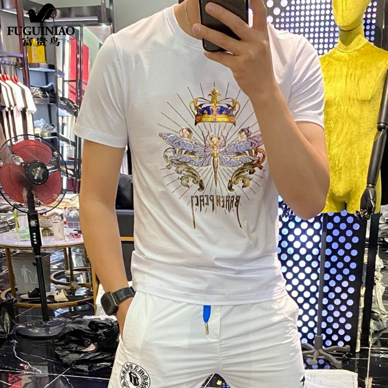 Rich bird ice-sensing T-shirt men's small neckline hot drill country tide ruffian handsome modal short-sleeved summer mercerized cotton design touch soil