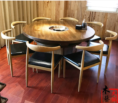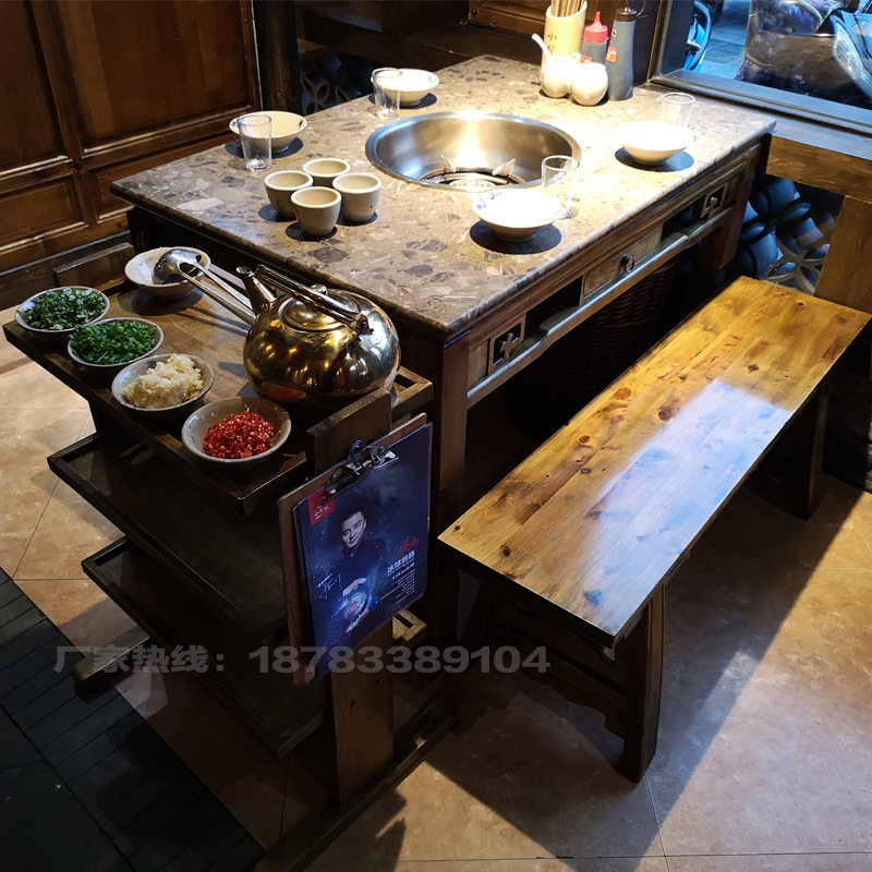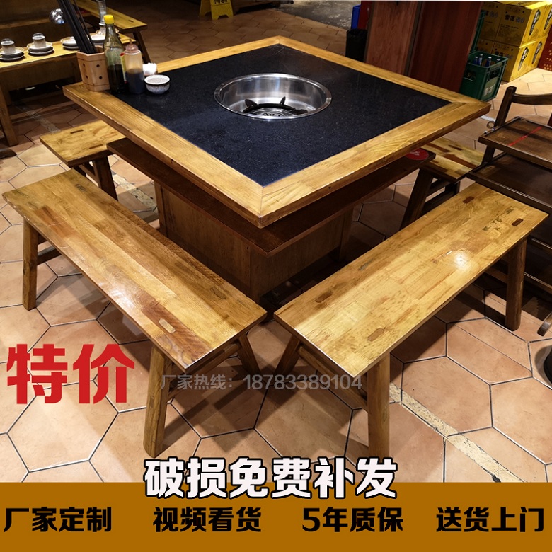 Carved marble hot pot table Chongqing old hot pot table and chair Induction cooker gas stove Commercial solid wood hot pot table customization