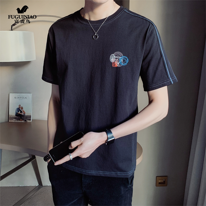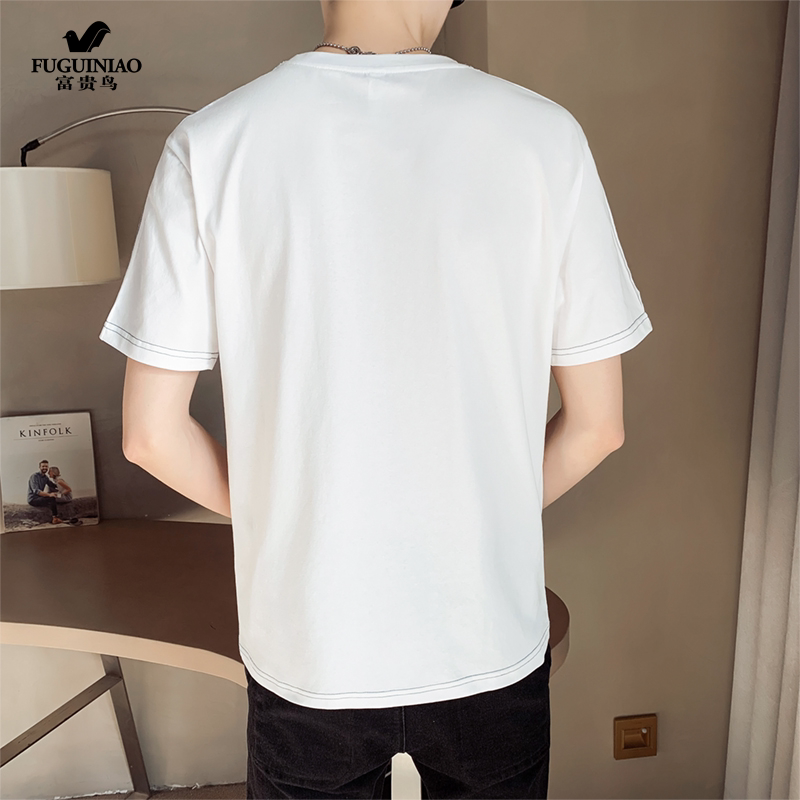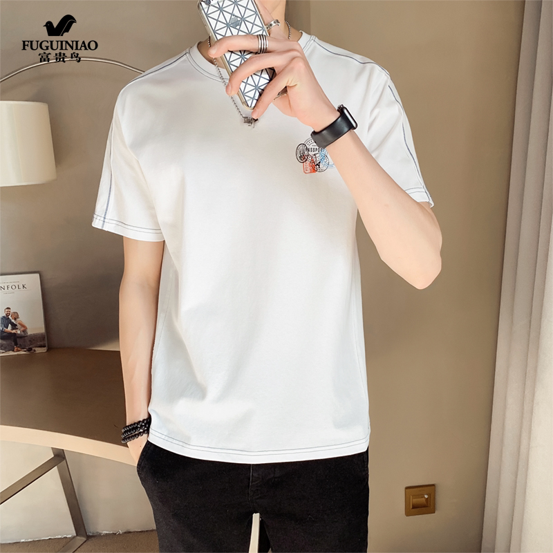 Rich bird ice-sensing T-shirt men's small neckline high street national tide ruffian handsome mercerized cotton short-sleeved summer modal design touch soil