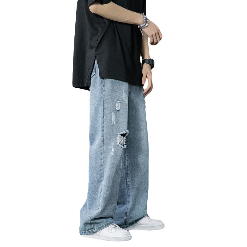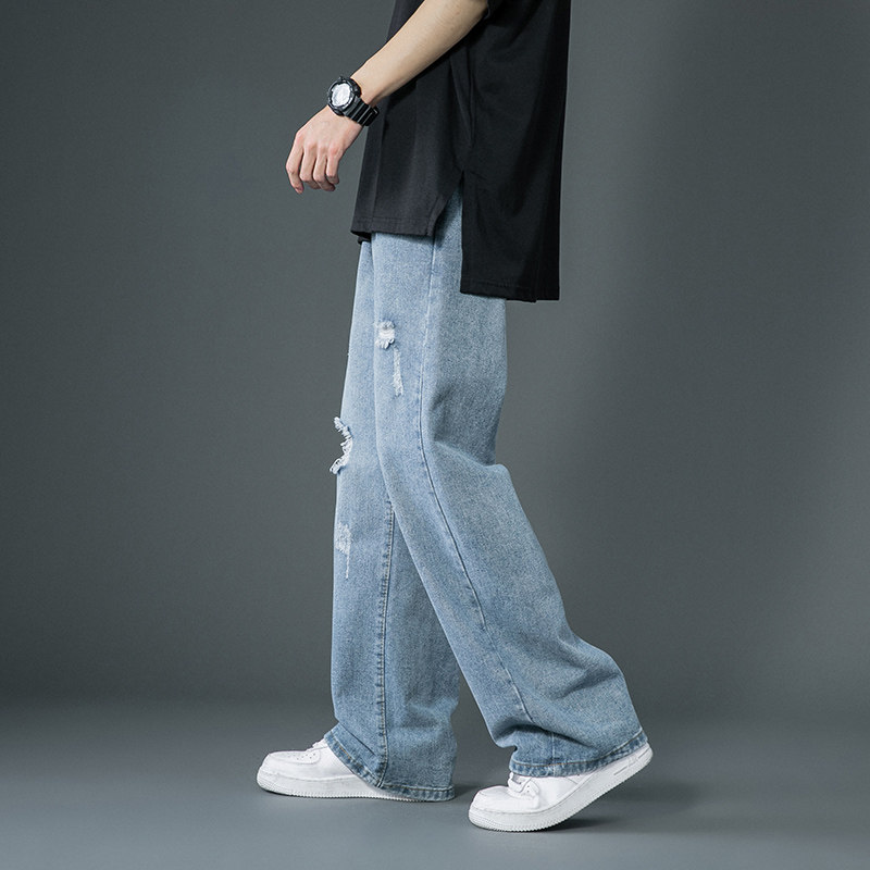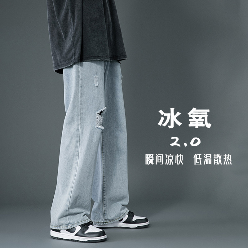 Hole In Cave Jeans Boy Spring Summer Thin with Tide Cards Loose Straight Barrel Drag Pants Harbor Wind High Street Casual Wide Pants