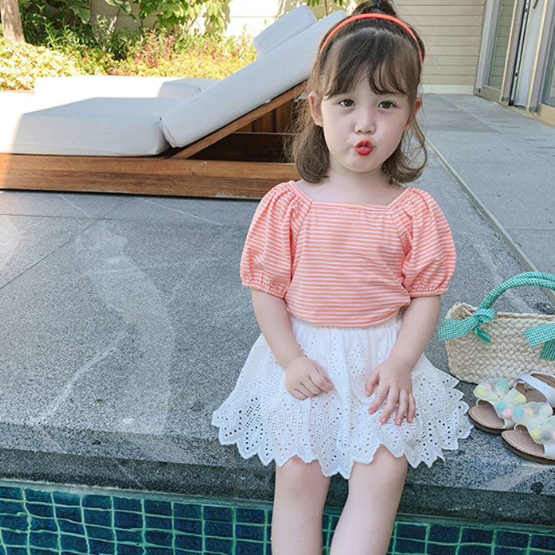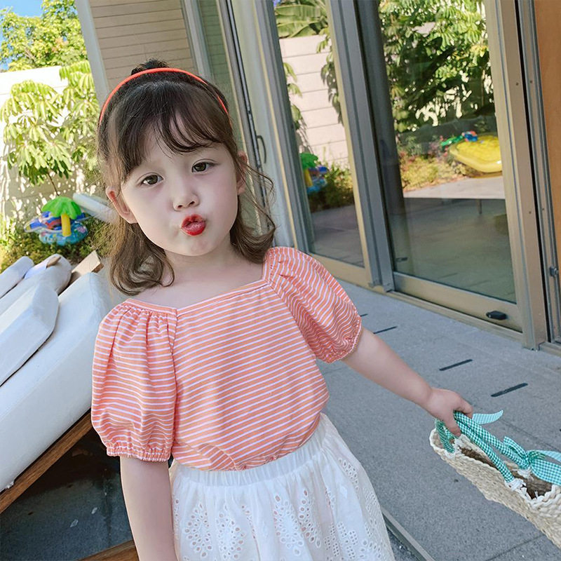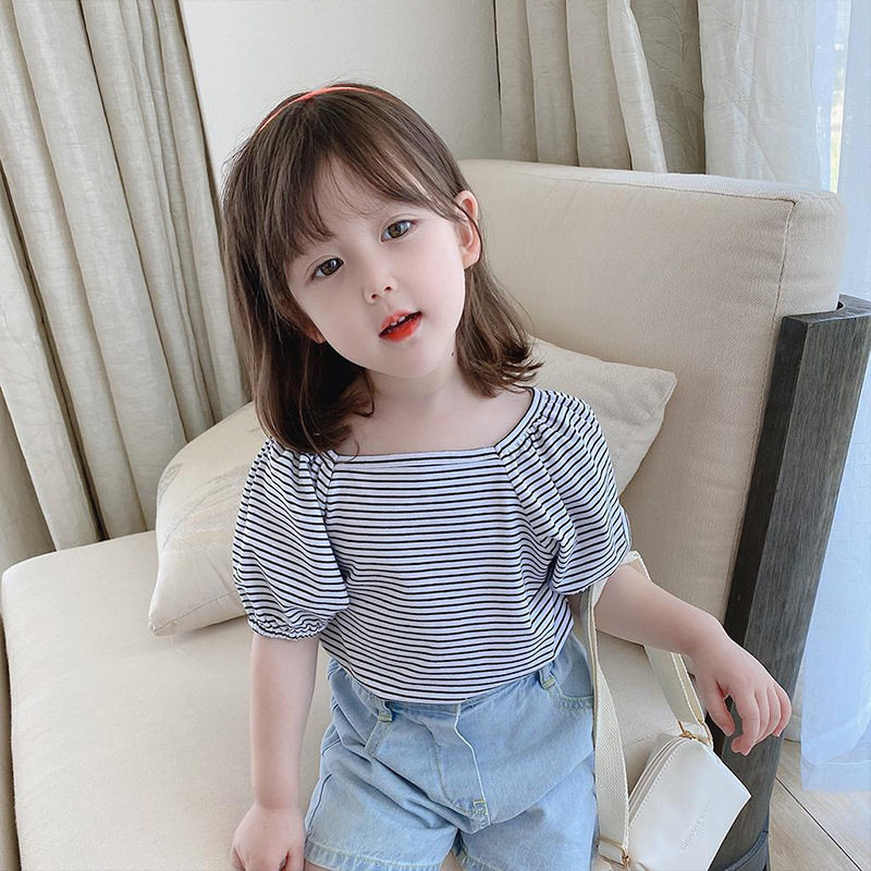 Girls Summer T - shirt 2022 new girl baby's handkerchief edition of tops children's ocean striped t - shirt