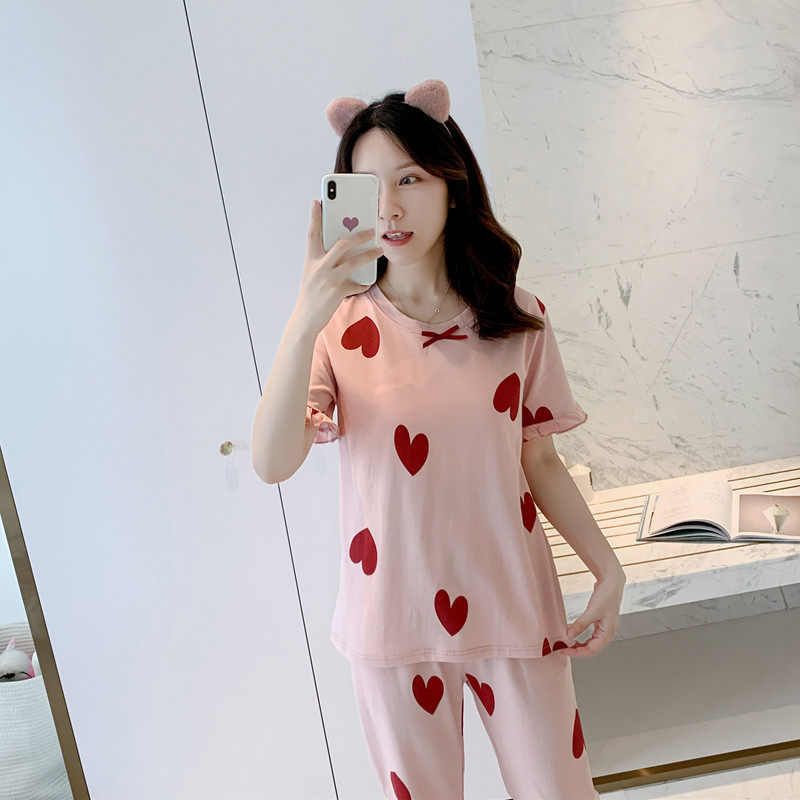 Pajamas with chest pad women's summer short-sleeved cropped pants pure cotton loose cute girl students can wear home service suits
