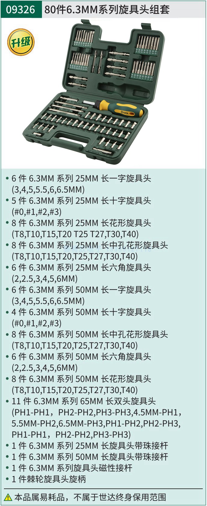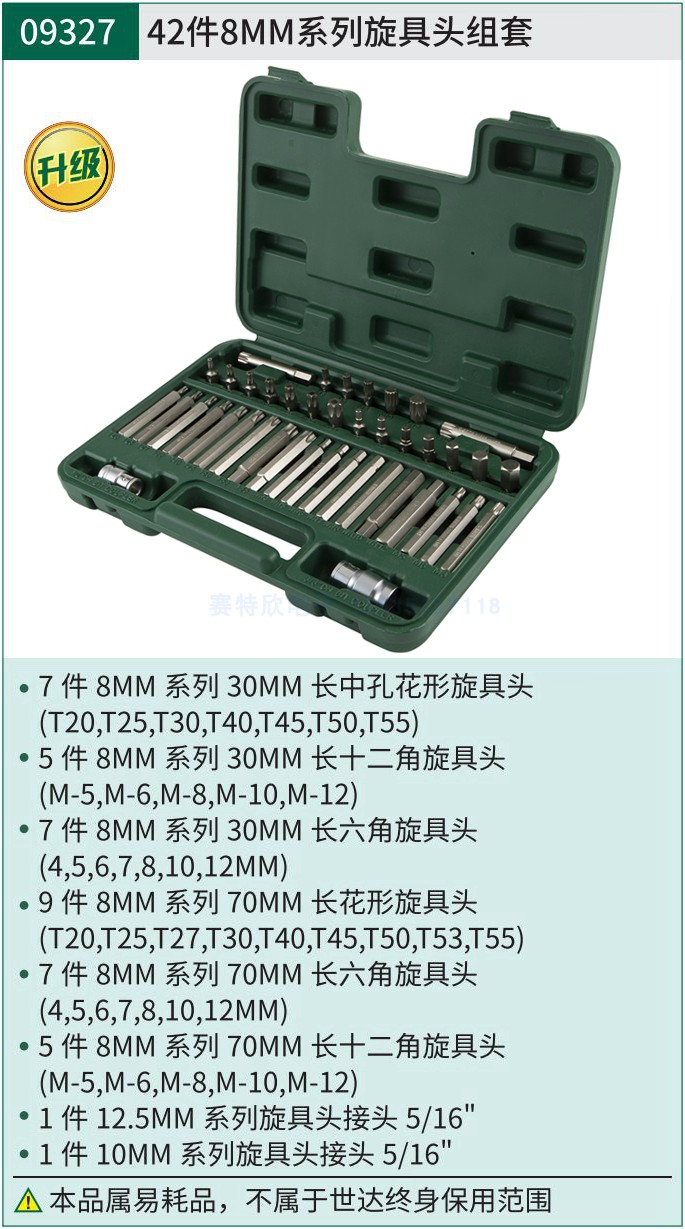 09324 sleeves and screwup head 60 pieces 09326 full size screwup head 80 pieces 09327 Anti-shock screwup head 42 pieces set 09602 percussion screwdrivers Group 8 pieces 6