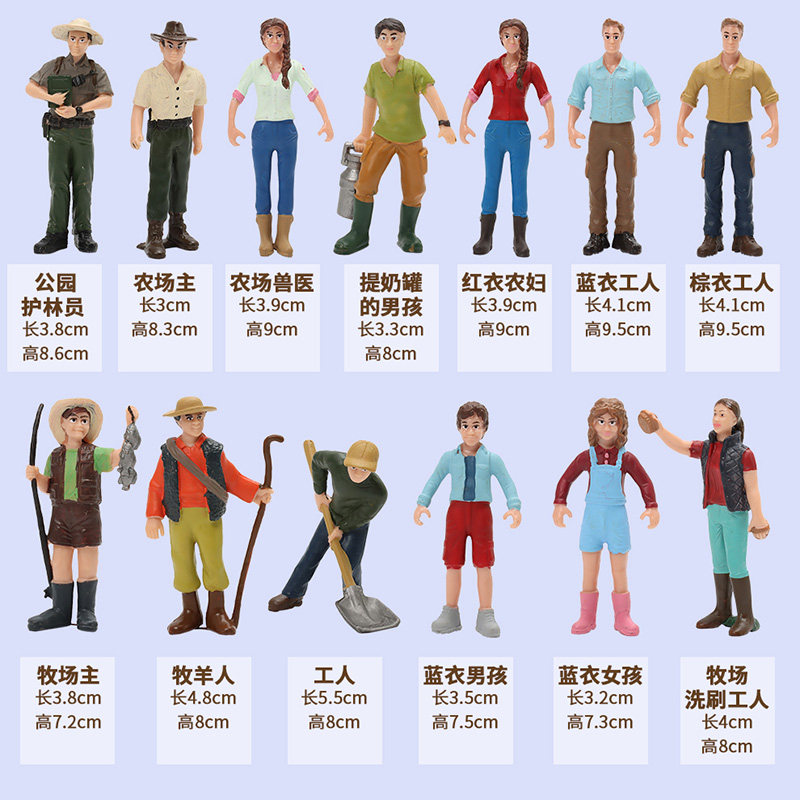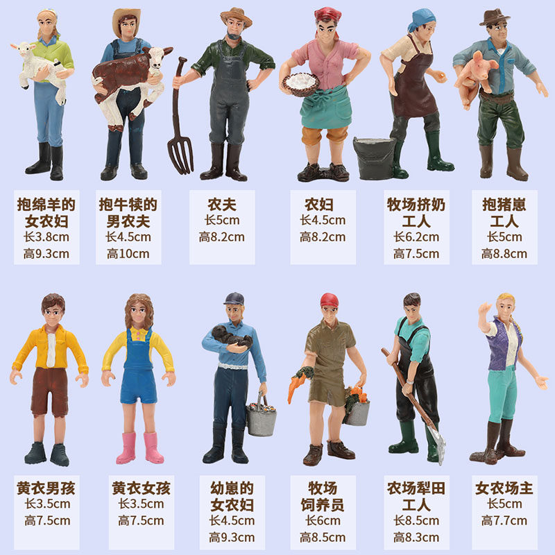 Female farmer holding sheep model (3.8*9.5cm)Male farmer model holding calves(4.5*10cm)Farmer model(5*8.2cm)Farmer's model (4.5*8.2cm)Ranch milkwoman model (6.2*7.5cm)Worker model holding piglets(5*8.8cm)Boy in yellow (3.5*7.5cm)Girl in yellow (3.5*7.5cm)Female farmer holding cubs (4.5*9.3cm)Ranch keeper model(6*6*7.5cm)Yellow-clad girl model (3.5*7.5cm)Female farmer holding cubs (4.5*9.3cm)Pasture keeper model(6* 8.5 cm) Farm Plougher Model (8.5*8.3 cm) Female Farmer Model (5*7.7cm)Farmer Model (3*8.3cm)Farm Veterinary Model (3.9*9cm)Boy Model of Milk Tank (3.3*8cm)Red-clad Farmer's Woman Model (3.9*9cm)Blue Worker Model (4.1*9.5cm)Brownworker Model(4.1*9.5cm)Rancher Model (3.8*7.2cm)Shepherd Model (4.8*4.8*4.8*9.5cm)Brownworker Model(4.1*9.5cm)Rancher Model (4.8*7.2cm)Pastor Model(4.8**) 8 cm) Worker model (5.5*8cm)Boy in blue model (3.5*7.5cm)Girl in blue model (3.2*7.3cm)Ranch scrubbing worker model (4*8cm)