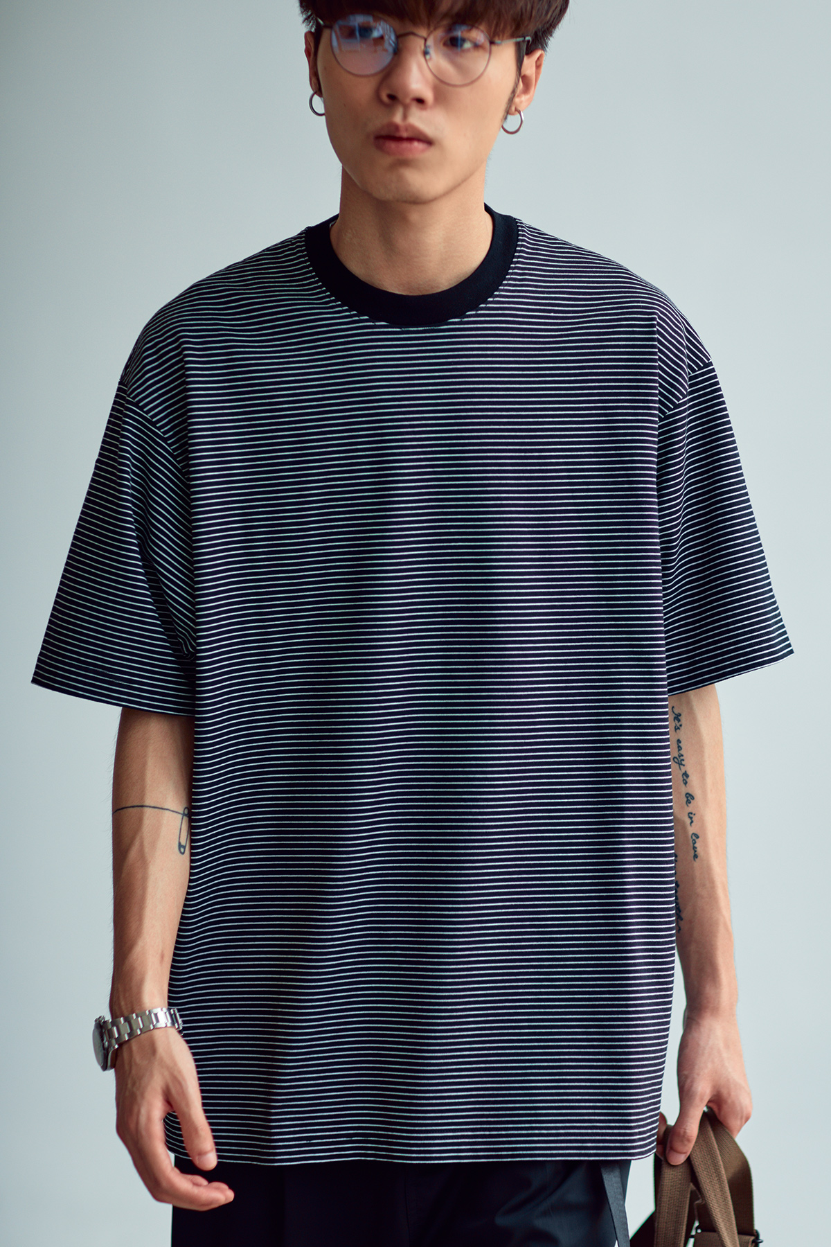 Thick solid stripes HUMANIMAL Japan imports Giza Egyptian cotton long suede cotton round collar base short sleeve T-shirt