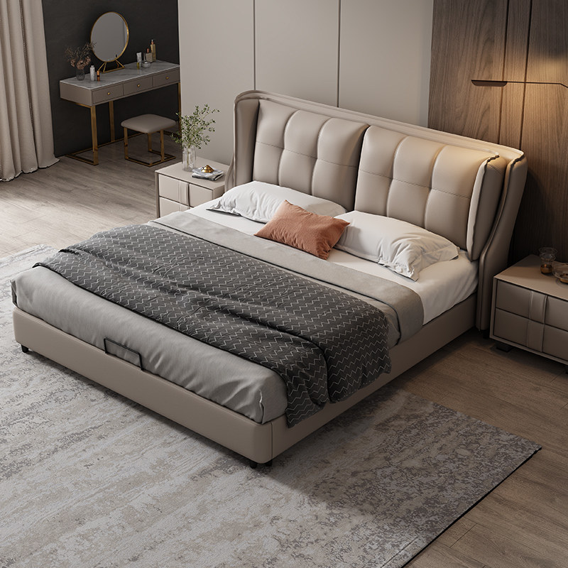 Nordic Bed Ins Wind Mesh Red Master Bedroom Modern Minima Double Man Bed Light Lavish Genuine Leather Bed 1 8 m Head Layer Cow Leather-Taobao