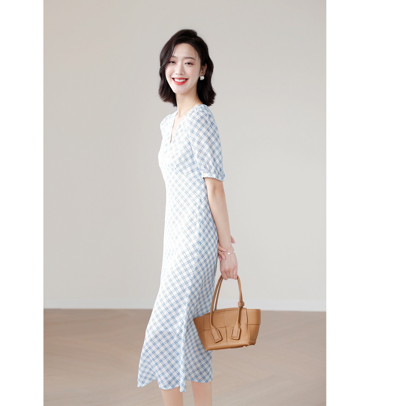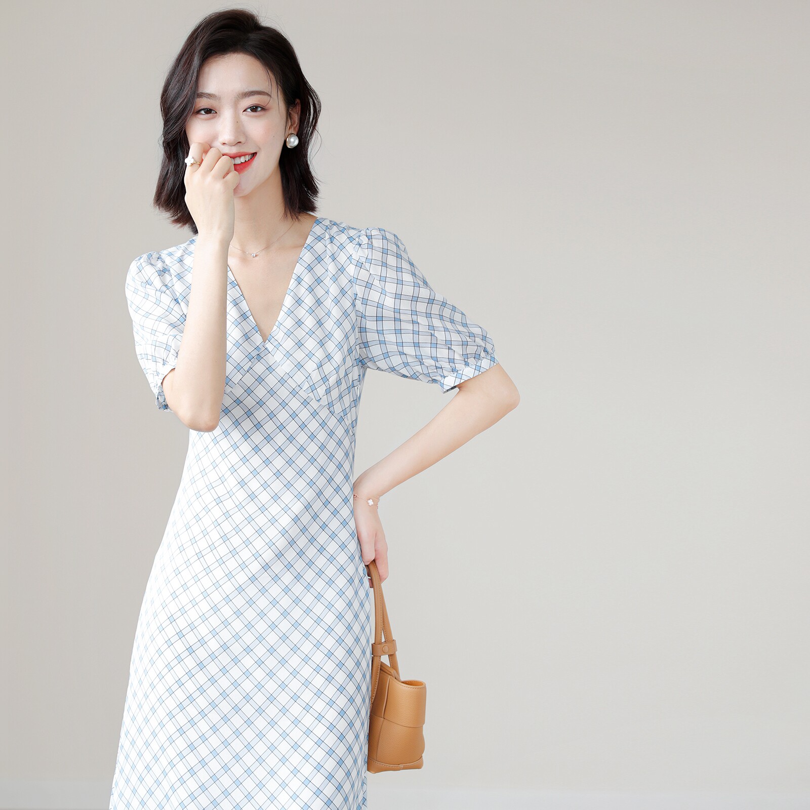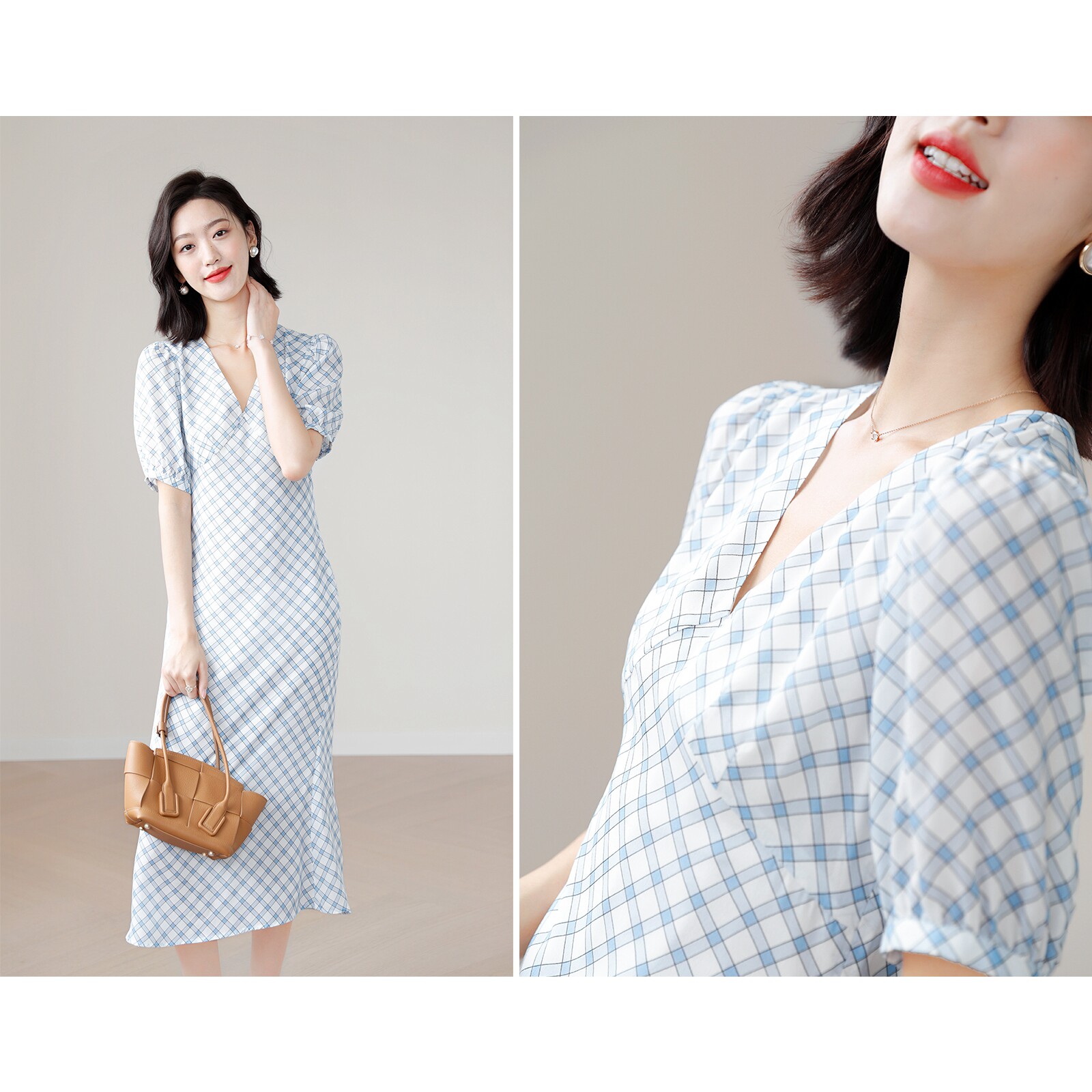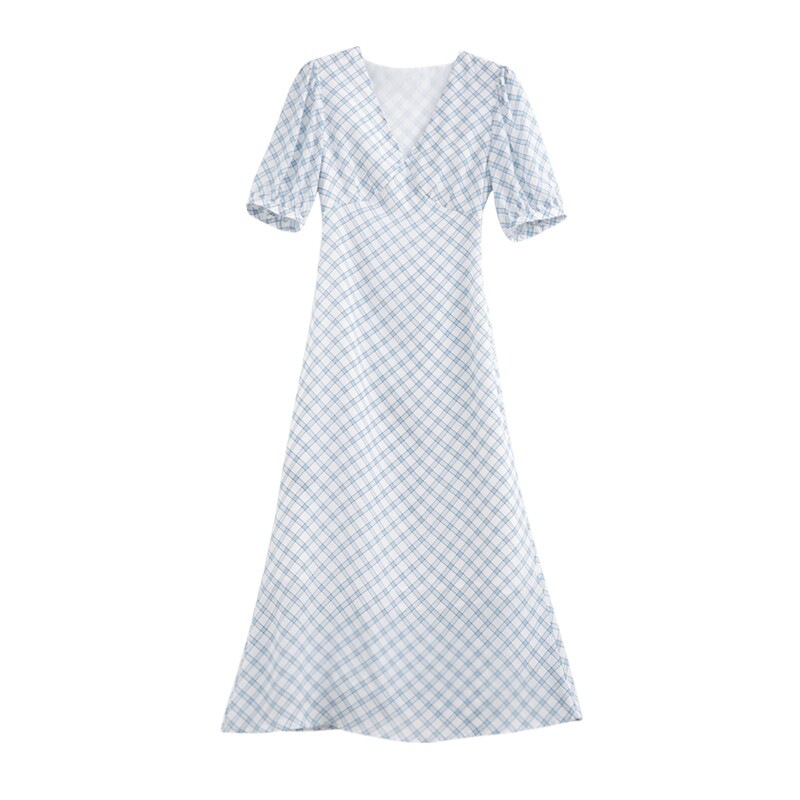 LOSTSOULS French retro LITERARY BLUE and white plaid THIN AND HIGH V-neck SILK DRESS DATING COFFEE break skirt