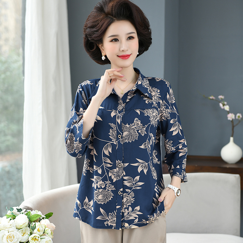 Summer new women's printed shirt seven-point sleeve cotton silk middle-aged and elderly mother top floral large size shirt thin