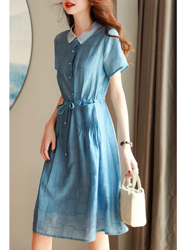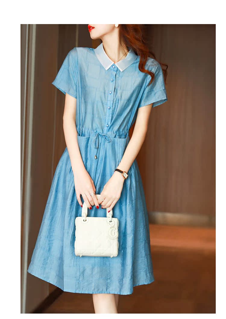 Baozi 2022 summer new dress women's solid color Tencel pocket drawstring waist pearl buckle mid-length skirt thin women