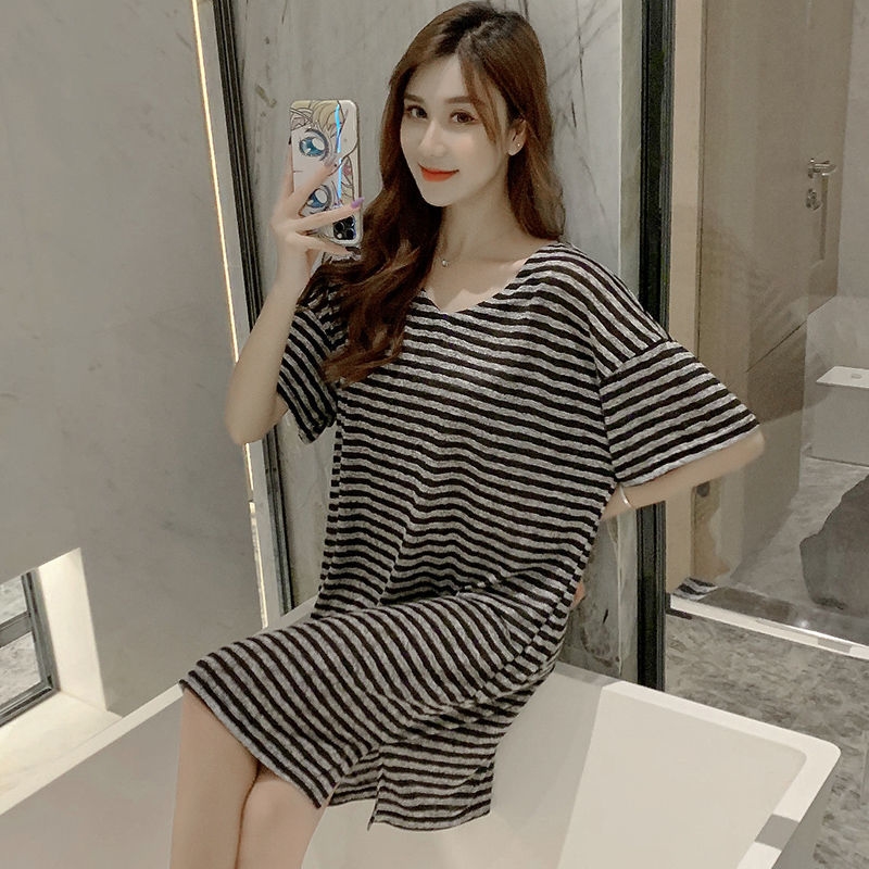 Sleeping Skirt Woman Summer Plus Fat Increase Student Cute Striped Modale Short Sleeve Foreign Dress 200 Catty of Home Home Clothes