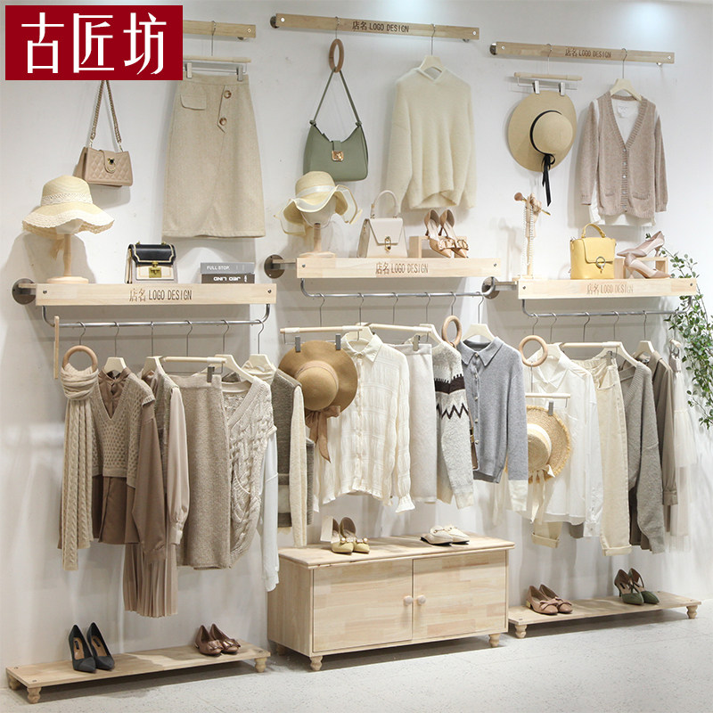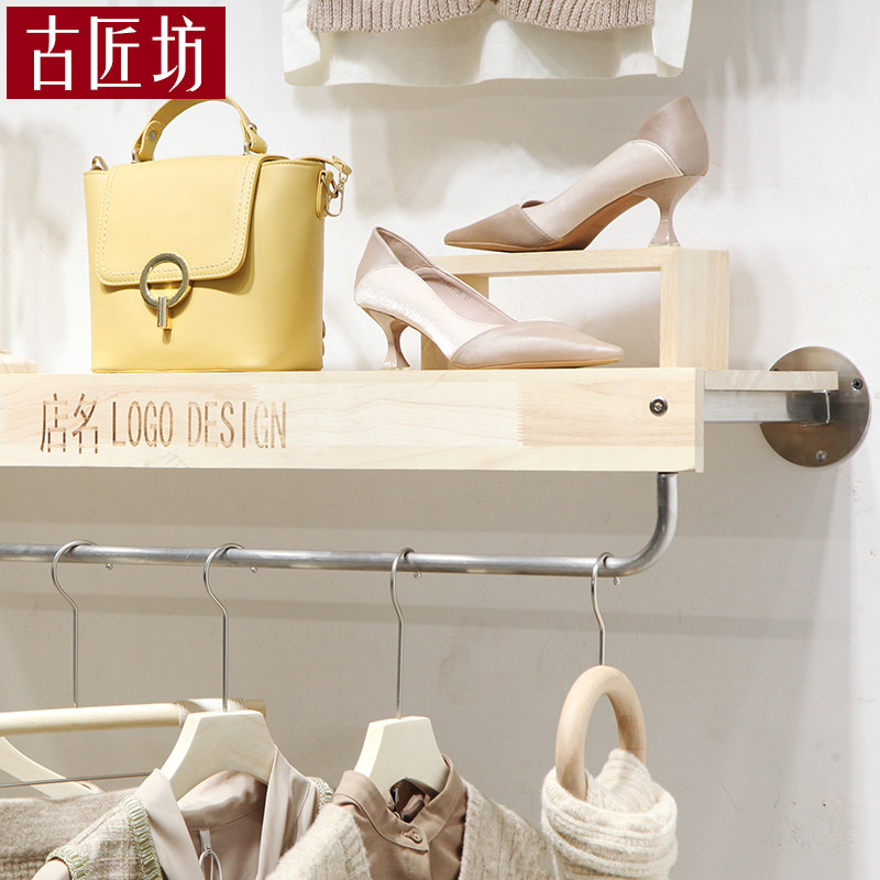 Women's Clothing Store Shelf Clothing Shop Upper Wall Hung Hanger Stainless Steel Show Wood Clothing Rack Clothes Rack Display Shelf