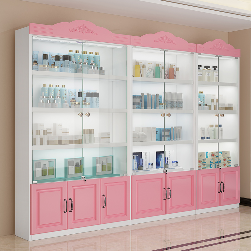 Cosmetics display storage cabinet with lock transparent double switch glass door model shelf with lamp partition multi-layer beauty cabinet