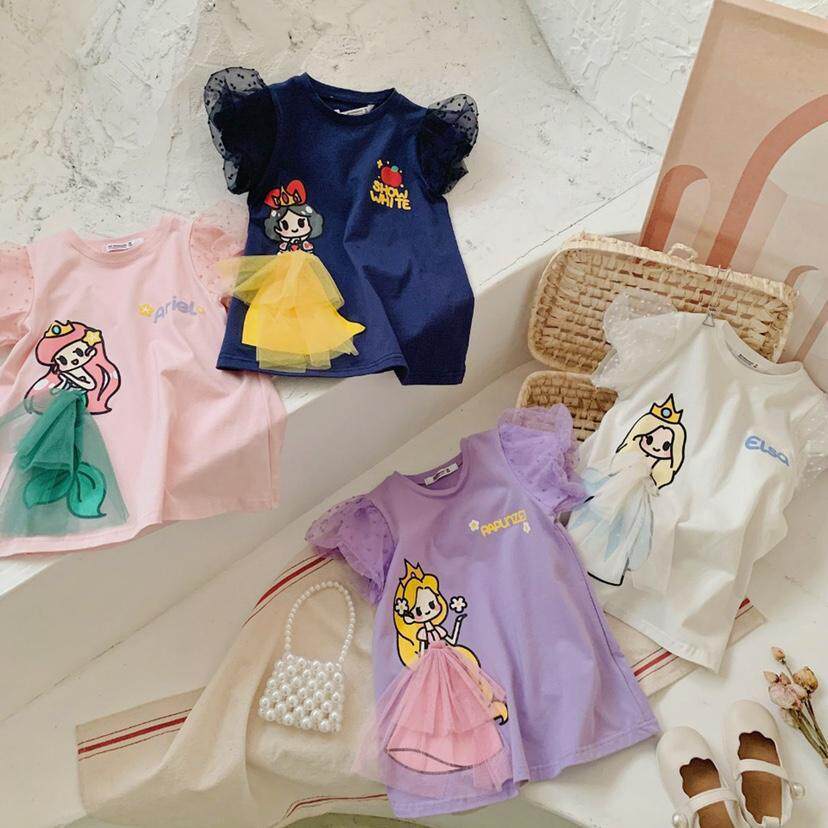 Child Clothing Girl Pure Cotton Short Sleeve Bubble Cuff Girl Cartoon Printed Solid Mesh Yarn T-shirt Skirt Girl Princess Dress-Taobao