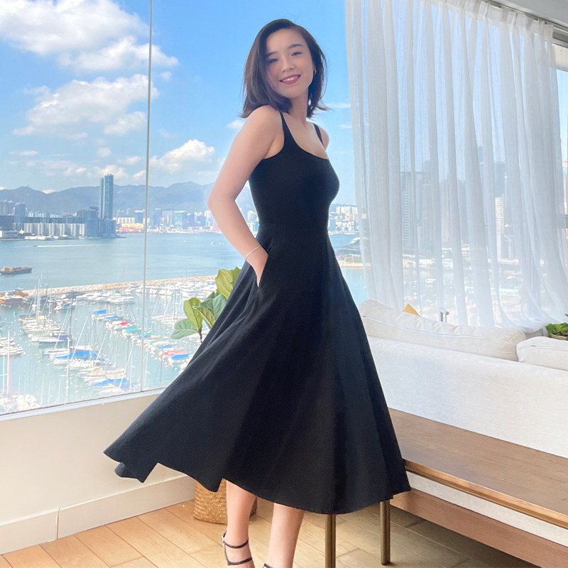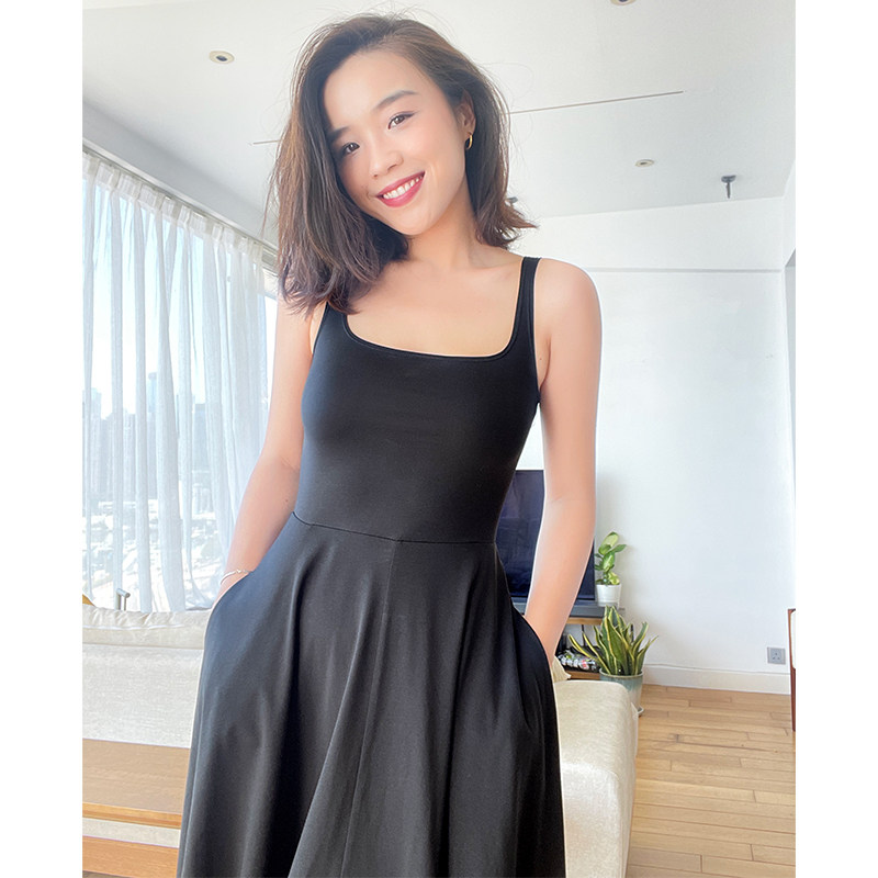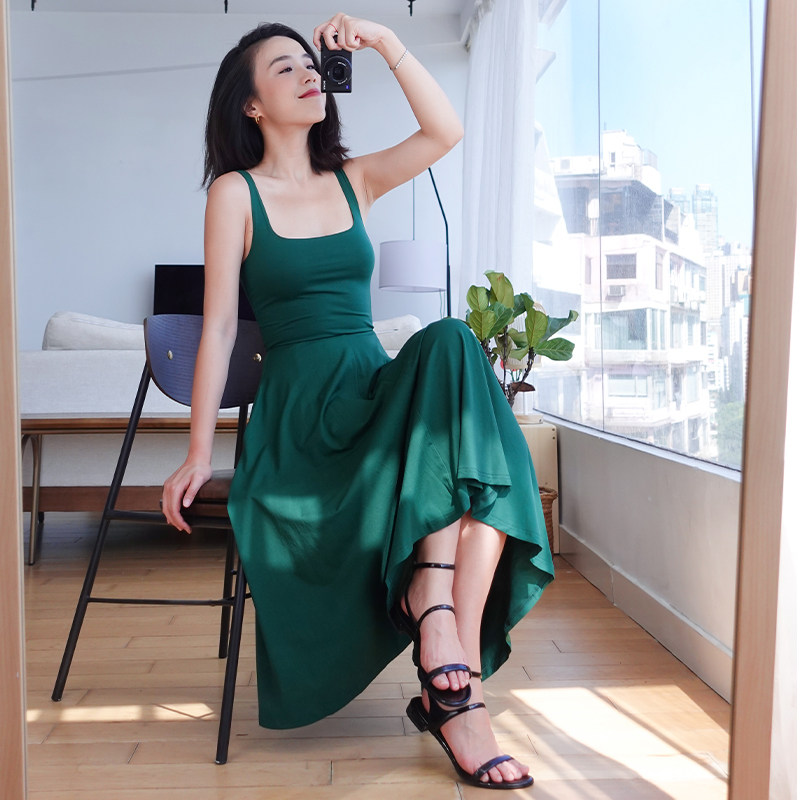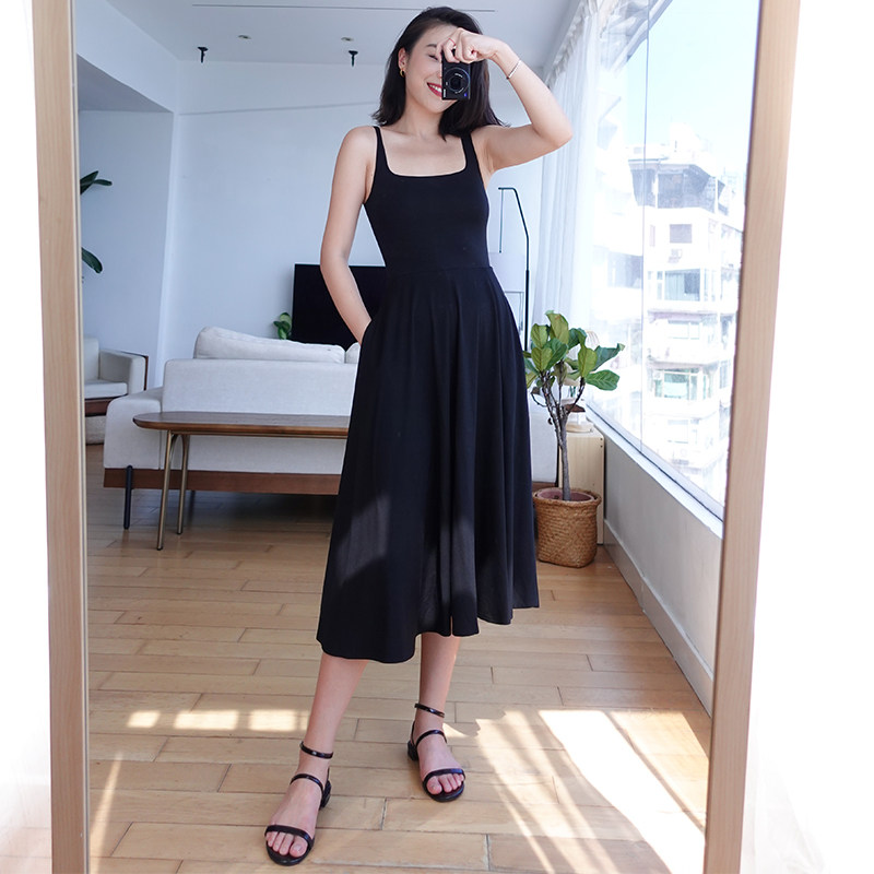 thecherrypie 21 summer French retro super beautiful solid color u-neck waist slim A-line sling dress